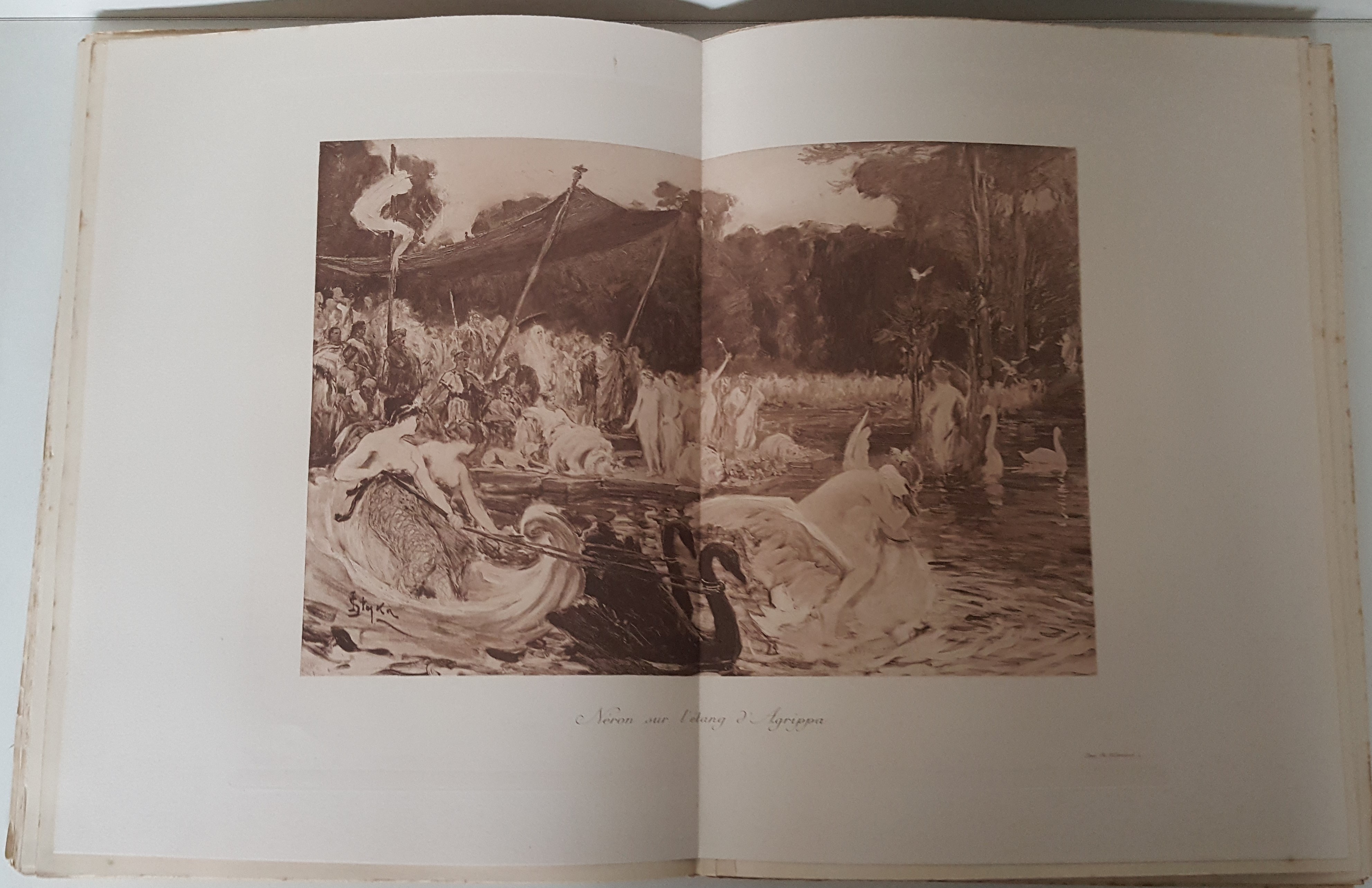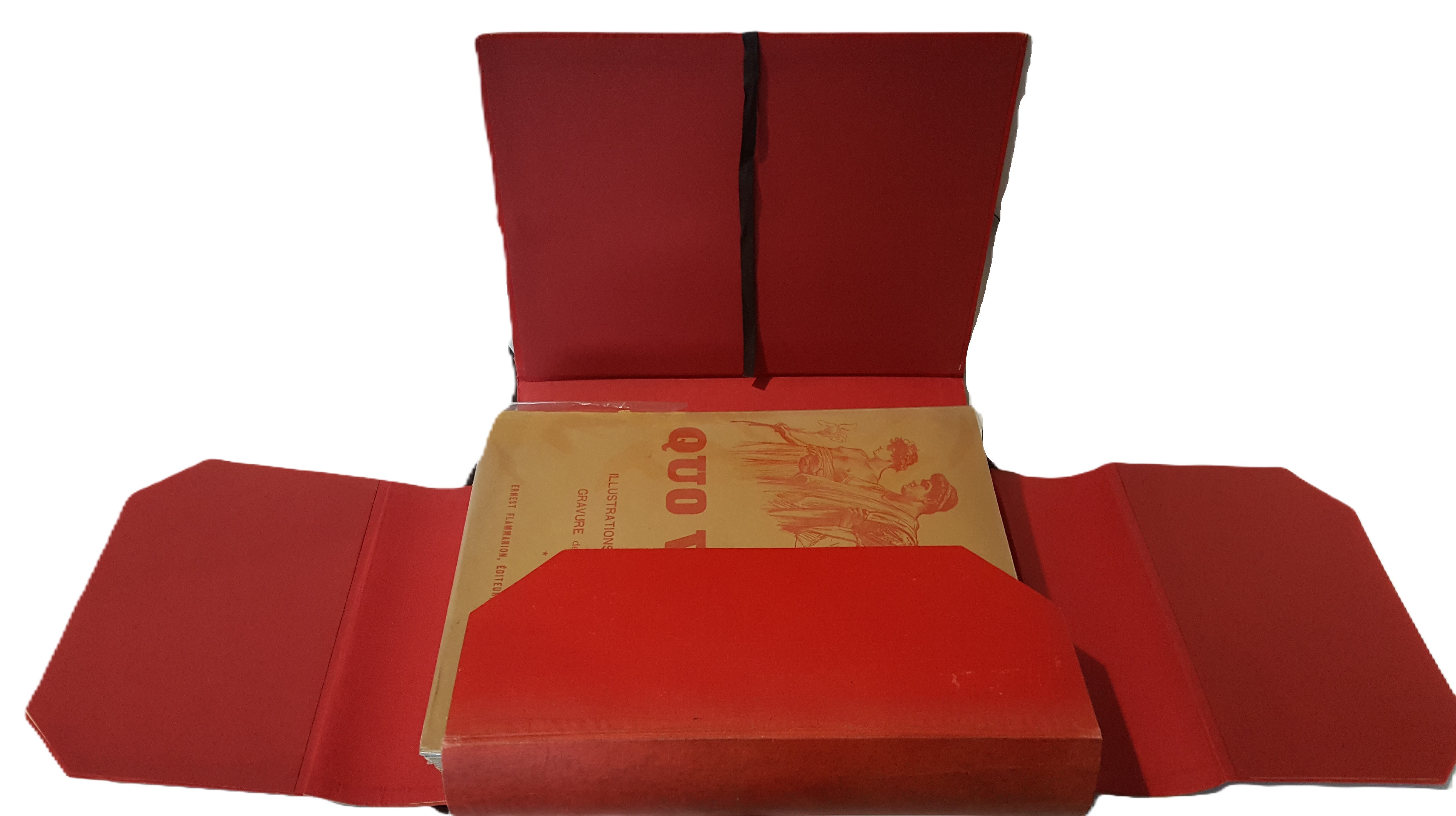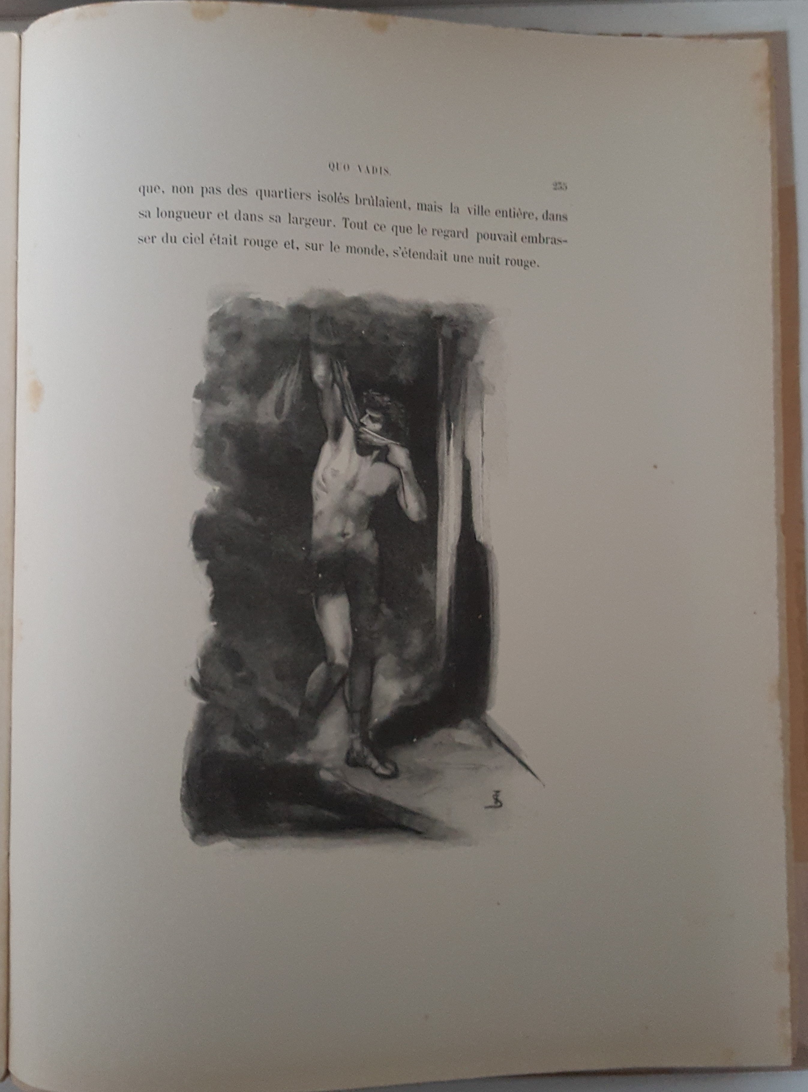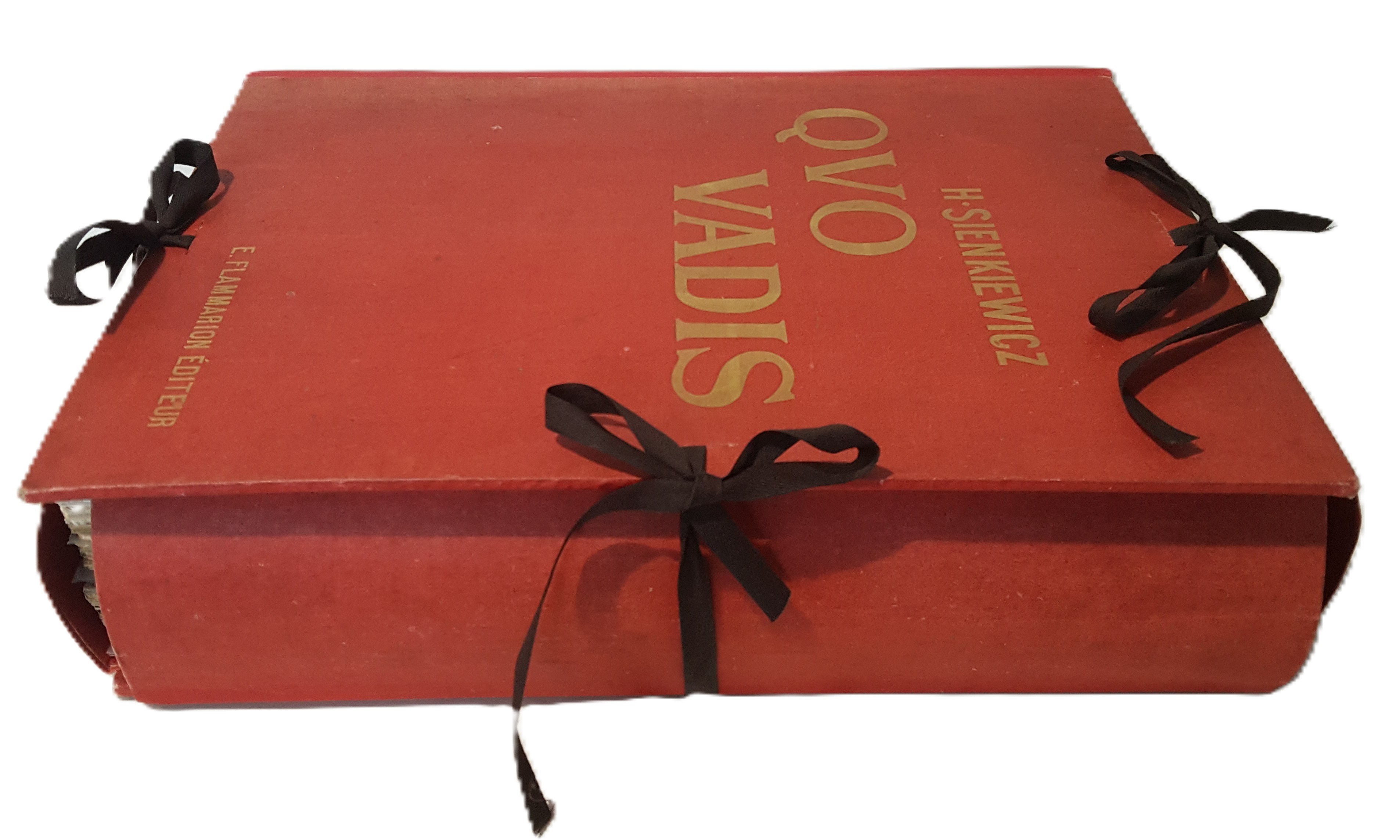 Quo Vadis. Roman Néronien. Traduction nouvelle et complete par E. Halperine-Kaminsky. Édition illustrée par Jan Styka. Paris b. r. (ca. 1900). E. Flammarion, Éditeur. Ryciny na osobnych tablicach (w tym składane) oraz drzeworyty w tekście. Wymiary teki 35x30 cm, stron 291; 235; 326. Wydanie w zeszytach - całość w płóciennej tece po renowacji. Ślady użytkowania (przybrudzenia teki), foxing-odbarwienia papieru, nieliczne przybrudzenia.