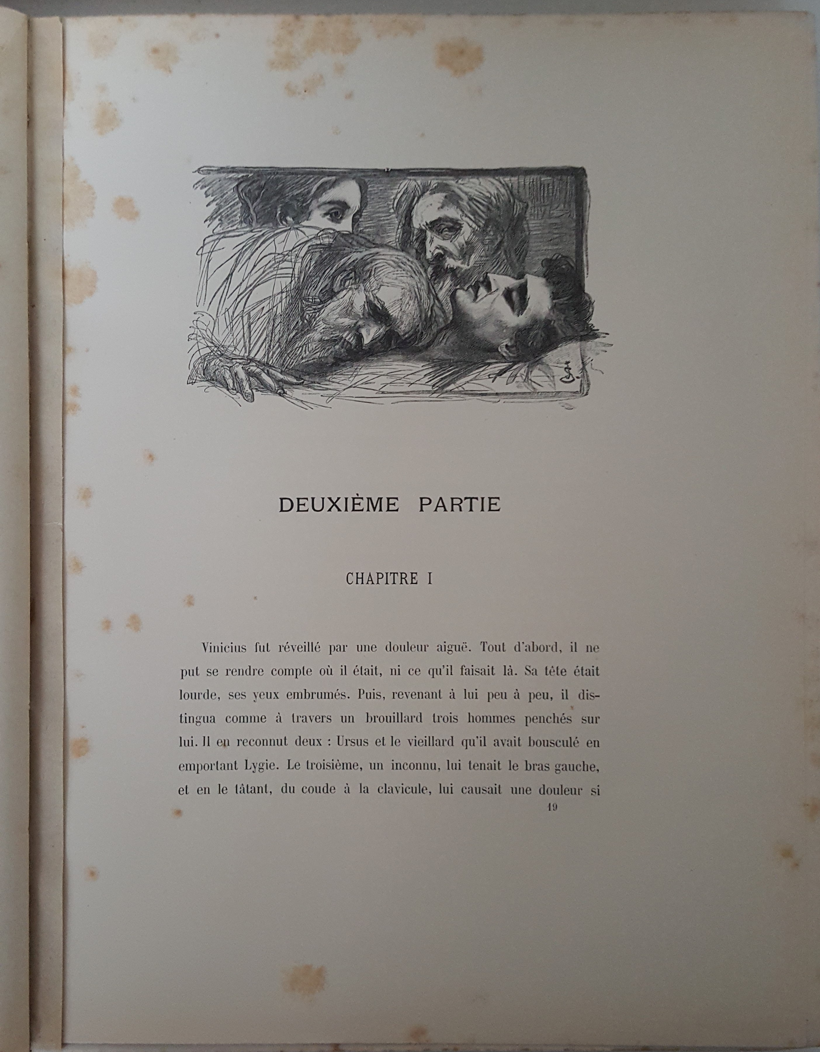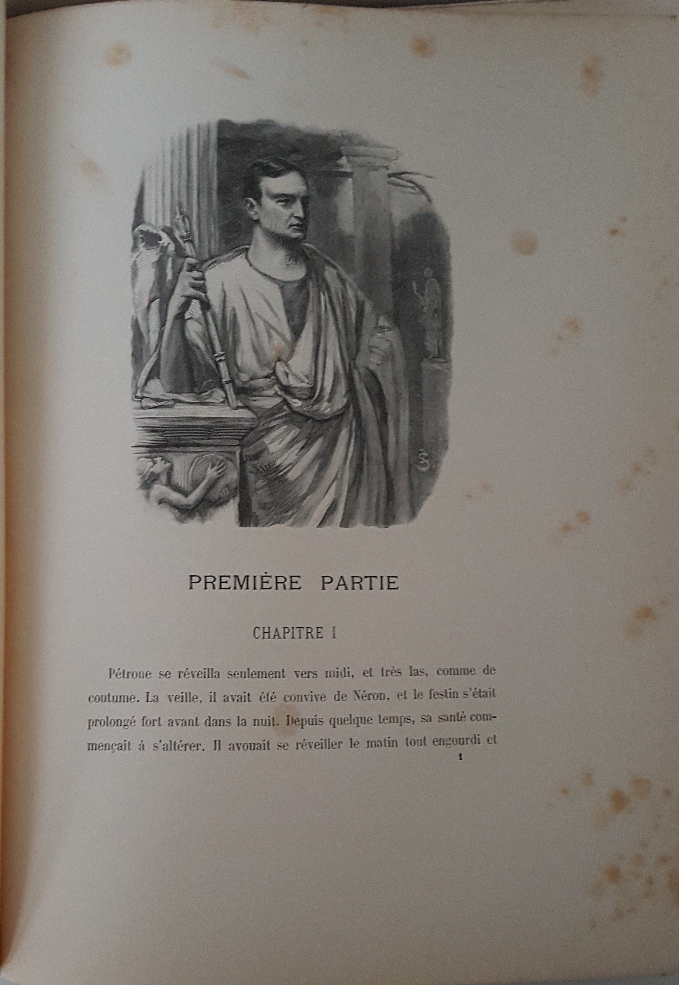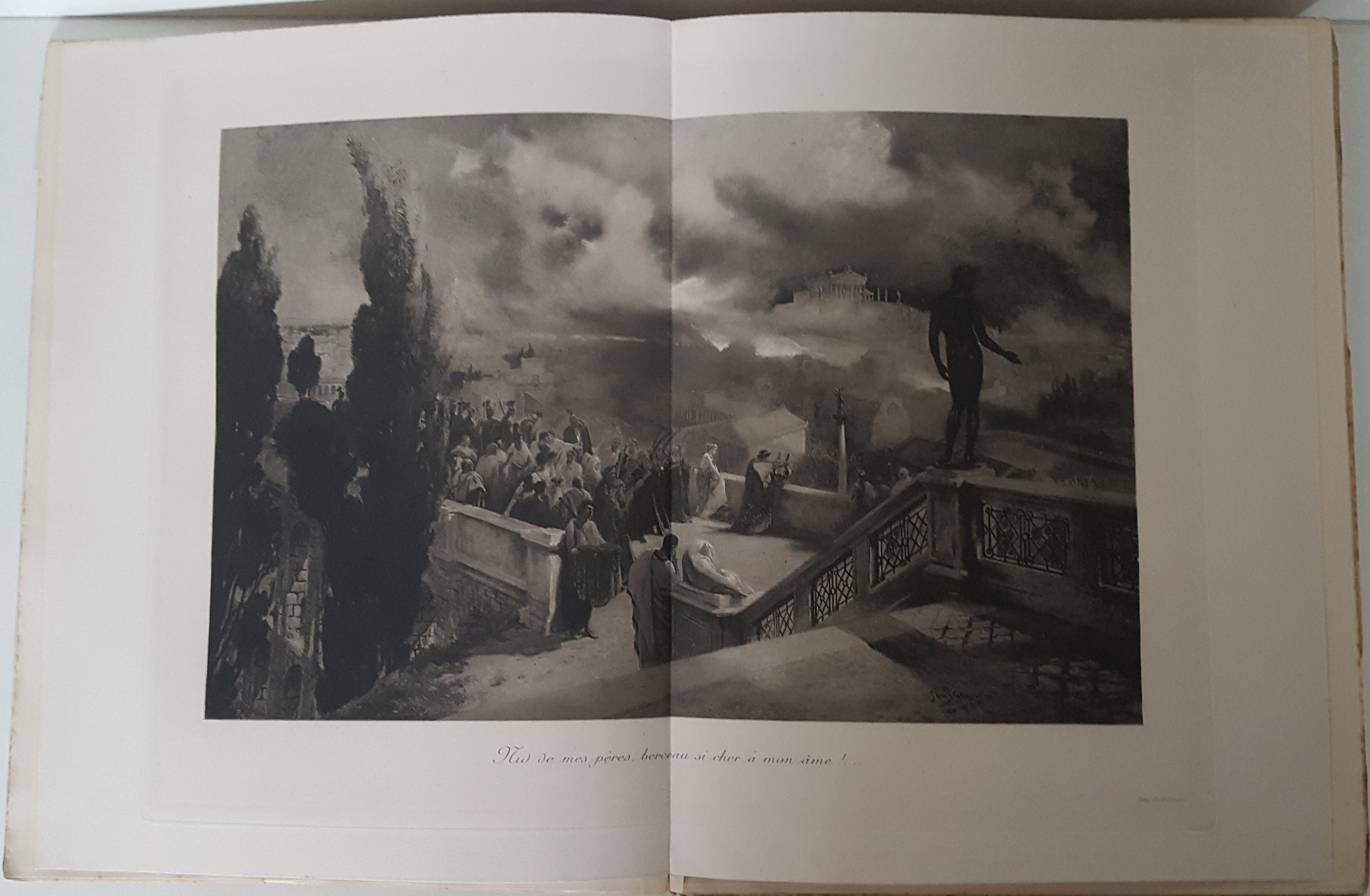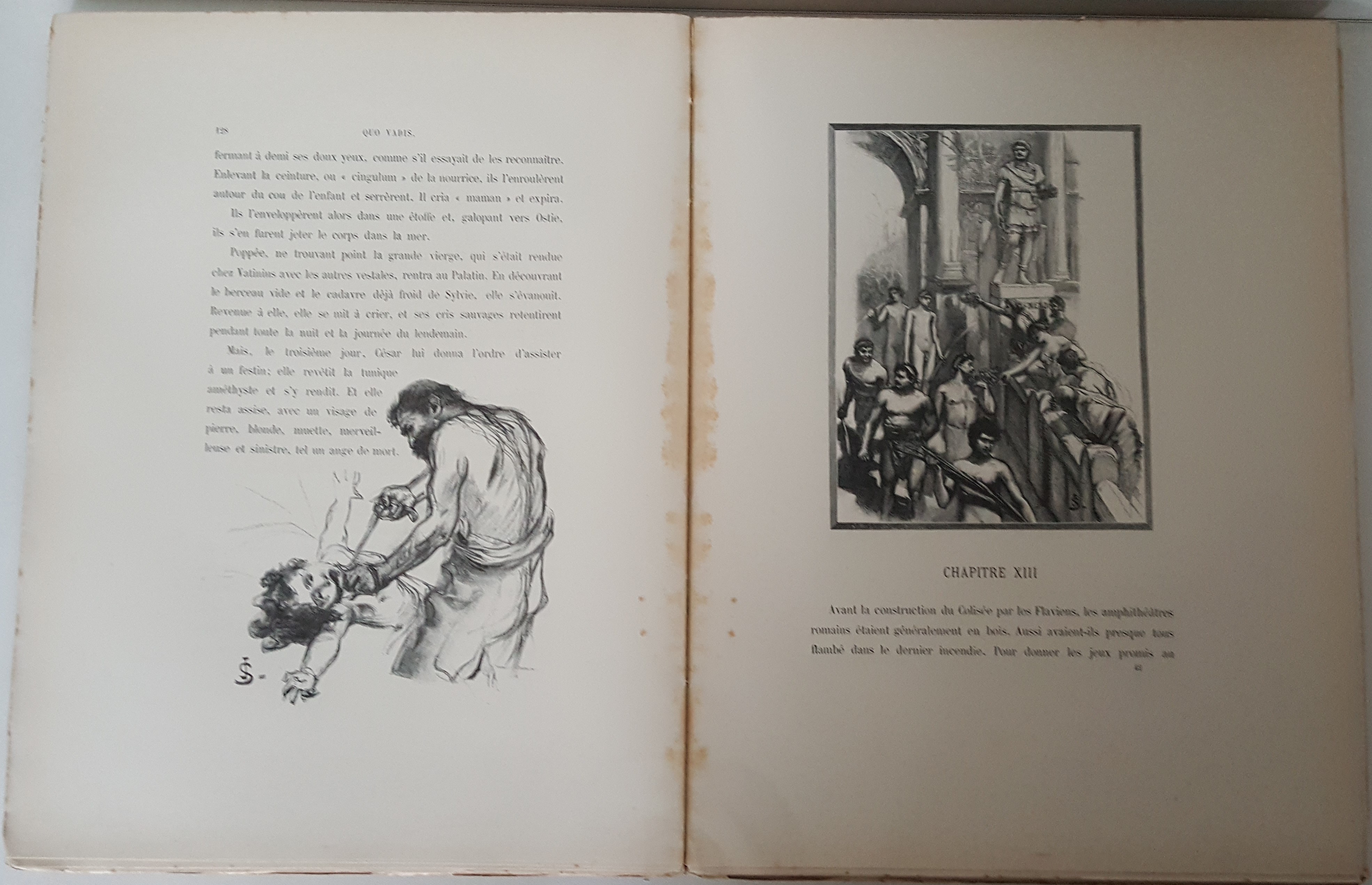 Quo Vadis. Roman Néronien. Traduction nouvelle et complete par E. Halperine-Kaminsky. Édition illustrée par Jan Styka. Paris b. r. (ca. 1900). E. Flammarion, Éditeur. Ryciny na osobnych tablicach (w tym składane) oraz drzeworyty w tekście. Wymiary teki 35x30 cm, stron 291; 235; 326. Wydanie w zeszytach - całość w płóciennej tece po renowacji. Ślady użytkowania (przybrudzenia teki), foxing-odbarwienia papieru, nieliczne przybrudzenia.