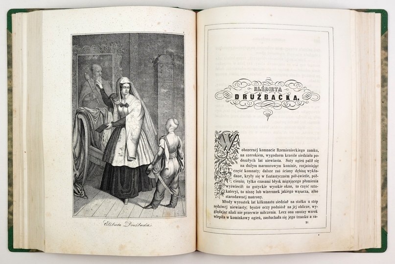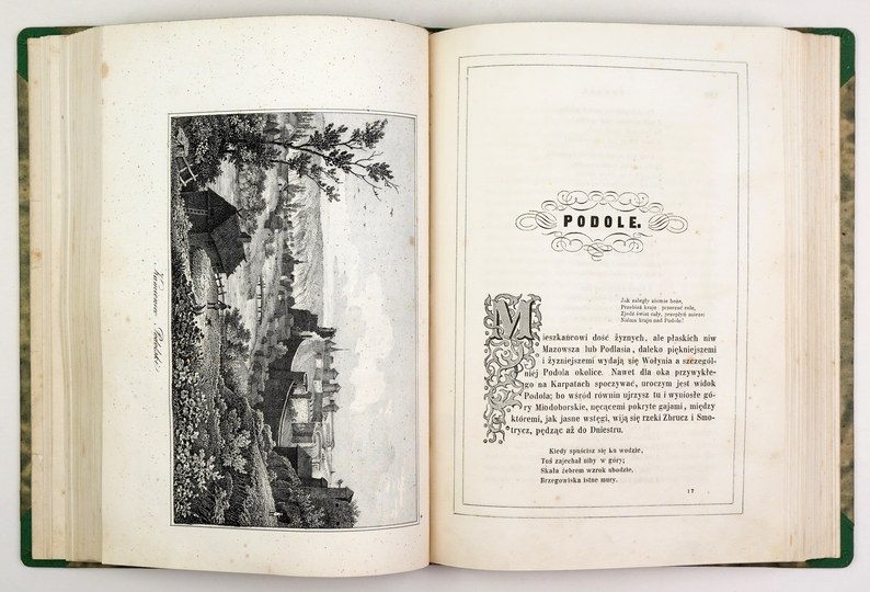 Banach 413. Miejscami zażółcenia papieru, wiele kart podklejonych w grzbiecie, niewielkie zabrudzenia. Zachowana tylna okł. brosz. Zbiór artykułów na różne tematy ozdobiony stalorytowymi lub litografowanymi tablicami z widokami, scenami rodzajowymi, portretami. Zaw. m.in.: Słoń, Przejażdżka do Czorsztynu, Zwyczaje i widowiska w Chinach, Czerkieska, Lasy dziewicze, Jan Zamojski, Podole, Cyganka, Kawiarnia w Paryżu, Kościół Ś. Krzyża na Łysej Górze, Okrężne w Sandomierskiem, Zaprowadzenie wiary chrześciańskiej w Polsce, Góra Zamkowa w Wilnie. Na tablicach (staloryty i litografie) widoki, sceny rodzajowe, portrety.
