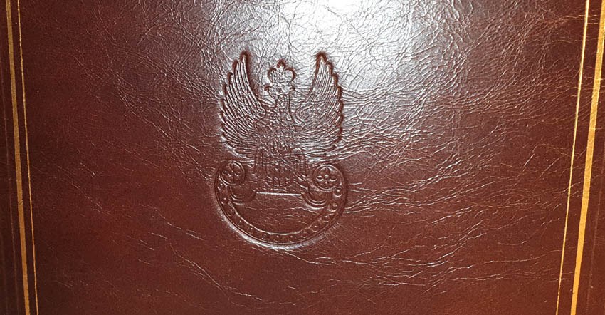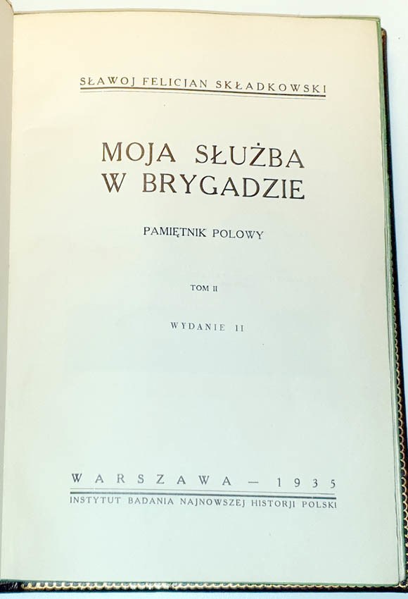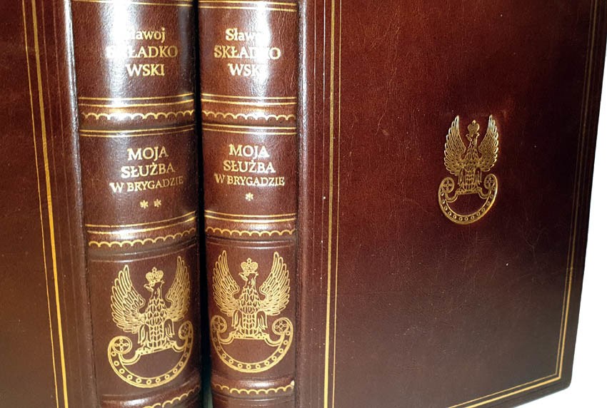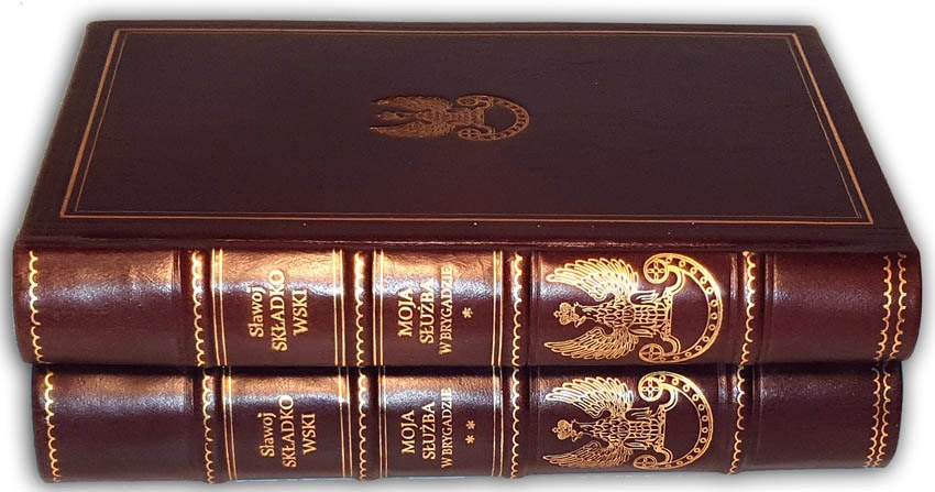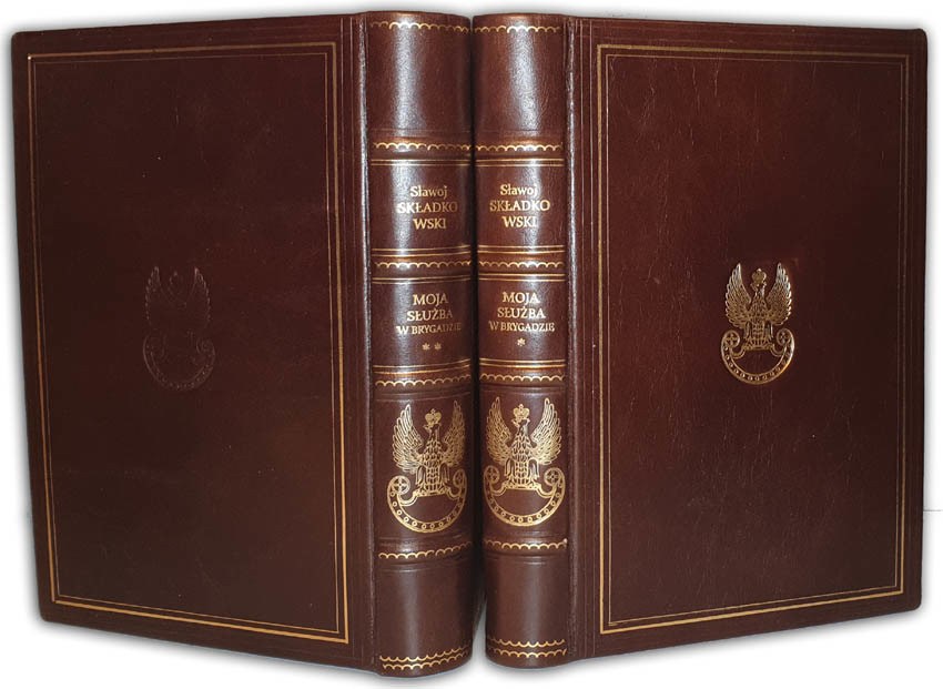 TWARDA OPRAWA PEŁNA SKÓRA WSPÓŁCZESNA, GRZBIETY Z WYPUKŁYMI ZWIĘZAMI, TŁOCZENIAMI I ZŁOCENIAMI,OKŁADKI OKOLONE PODWÓJNĄ ZŁOCONĄ LINIĄ, W ZWIERCIADLE ZŁOCONY ORZEŁ LEGIONOWY W KORONIE, POWTÓRZONY NA GRZBIECIE ORAZ W FORMIE SUCHEGO TŁOKU NA TYLNIM LICU, MARMORYZOWANE WYKLEJKI, OBCIĘCIAKART BARWIONE, W JEDNYM TOMIE ZACHOWANA MIĘKKA OKŁADKA BROSZUROWA
