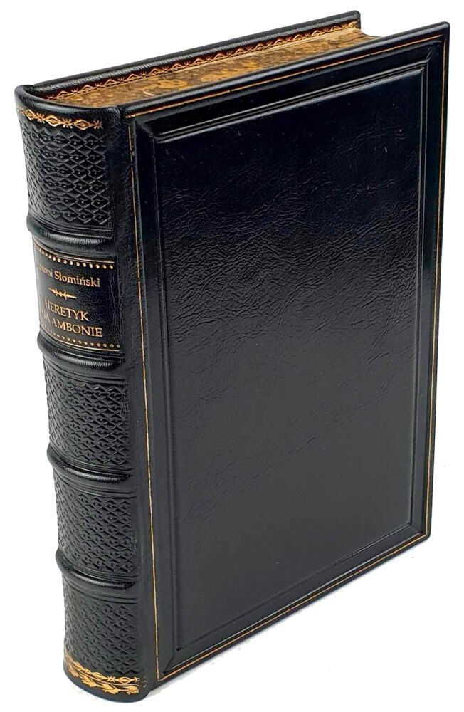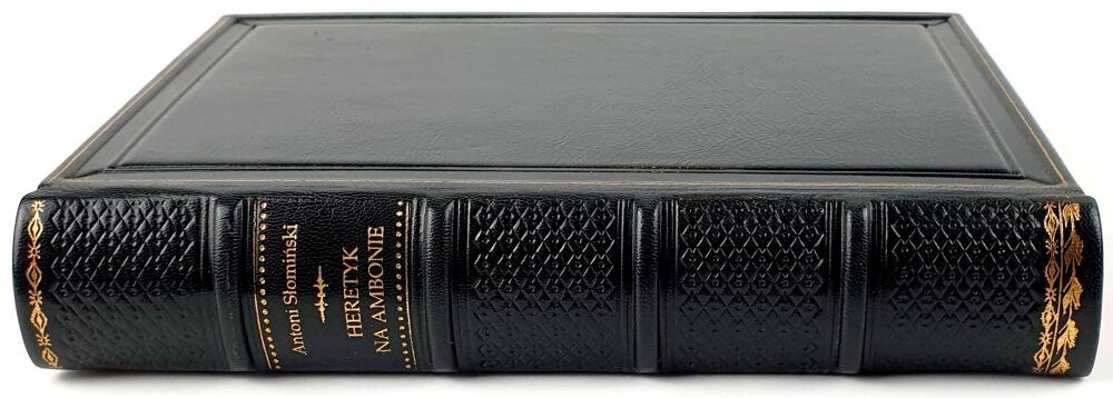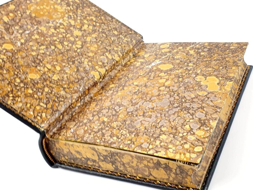 TWARDA OPRAWA PEŁNA SKÓRA WSPÓŁCZESNA. OKŁADKI OKOLONE TŁOCZĄ NA ZŁOTO I ŚLEPO RAMKĄ. GRZBIET Z WYPUKŁYMI ZWIĘZAMI, TŁOCZENIAMI I ZŁOCENIAMI ORAZ SZYLDZIKIEM. RĘCZNIE BARWIONY W MASIE PAPIER MARMORYZOWANY NA WYKLEJKACH, WSZYSTKIE OBCIĘCIA KART MARMORYZOWANE.