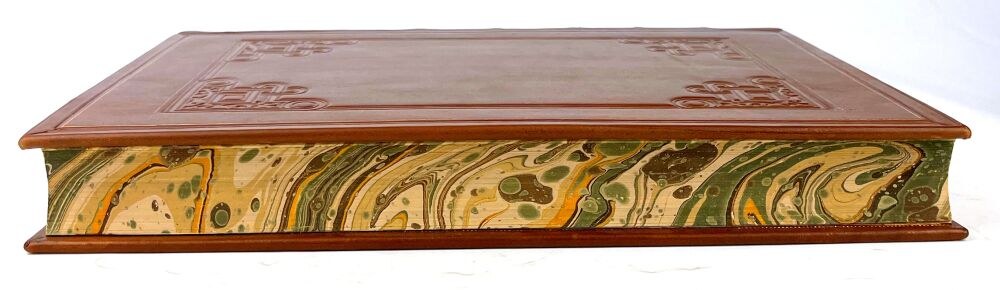TWARDA OPRAWA PEŁNA SKÓRA WSPÓŁCZESNA. OKŁADKA OKOLONA TŁOCZONĄ NA ŚLEPO BORDIURĄ. GRZBIET Z WYPUKŁYMI ZWIĘZAMI, GŁĘBOKIMI TŁOCZENIAMI, SZYLDAMI I ZŁOCENIAMI. WYKLEJKI Z RĘCZNIE BARWIONEGO W MASIE PAPIERU MARMORYZOWANEGO, OBCIĘCIA KART MARMORYZOWANE TYM SAMYM WZOREM.