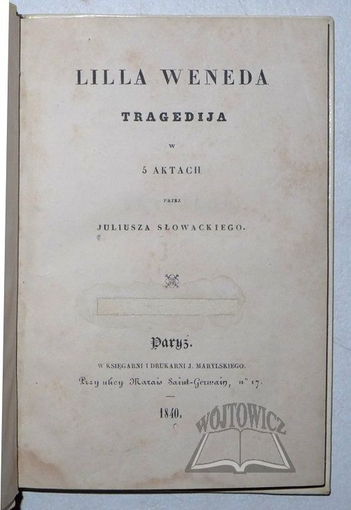Lilla Weneda Tragedija w 5 aktach. (Wyd. 1). Paryż 1840. W Księgarni i Drukarni J. Marylskiego. 16 cm, s. XV, [1], 174, [1]. opr. sk. introligat. współcz.Oprawa artystyczna wyk. przez "Librarium D. Bo...