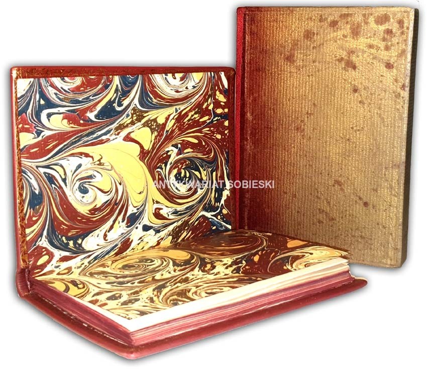 TWARDA OPRAWA PEŁNA SKÓRA WSPÓŁCZESNA Z TŁOCZENIAMI I ZŁOCENIAMI. GRZBIET Z WYPUKŁYMI ZWIĘZAMI PODKREŚLONYMI ZŁOTYMI ORNAMENTAMI, DWOMA BARWNYMI SZYLDZIKAMI I ZŁOCONYMI NAPISAMI, W ZWIERCIADLE OKŁADEK EFEKTOWNY GŁĘBOKO TŁOCZONY ORNAMENT, OKŁADKI OKOLONE ZŁOCONĄ BORDIURĄ. PAPIER WYKLEJEK MARMORYZOWANY, WNĘTRZA WYKOŃCZONE MISTERNYM ZOTYM SZLACZKIEM, CAŁOŚĆ W OCHRONNYM FUTERALE ZDOBIONYM PAPIEREM MARMORYZOWANYM.