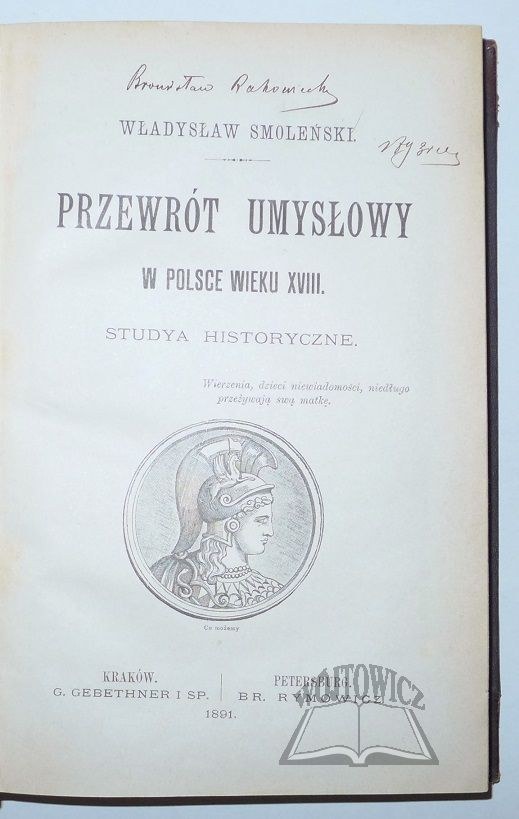 Przewrót umysłowy w Polsce wieku XVIII. Studya Historyczne. (Wyd. 1). Kraków 1891, G. Gebethner i Sp., Petersburg, Br. Rymowicz. 8, s. [4], 424, VI, [1], zdobniki w tekście, opr. płsk. z epoki.Oprawa...