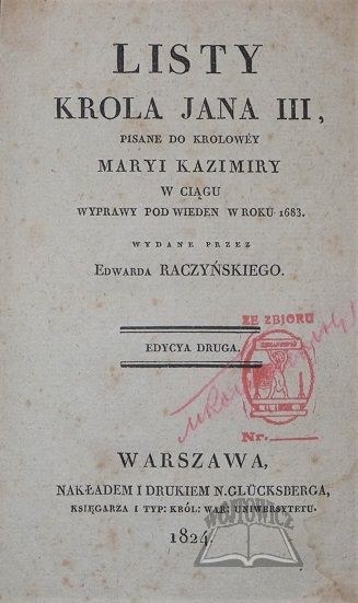 (SOBIESKI). LISTY krola Jana III pisane do królowey Maryi Kazimiry w ciągu wyprawy pod Wiedeń w roku 1683. Wydane przez Edwarda Raczyńskiego. Edycya druga. Warszawa 1824. Drukiem N. Glücksberga. 8, k....