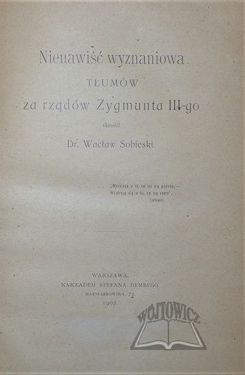 Nienawiść wyznaniowa tłumów za rządów Zygmunta III-go. Warszawa 1902. Nakł. Stefana Dembego. 8, s. [6], 199, [3], okł. brosz. przednia zachow., opr. pł. wtórna.Wyblaknięcie grzbietu oprawy, okł. brosz...