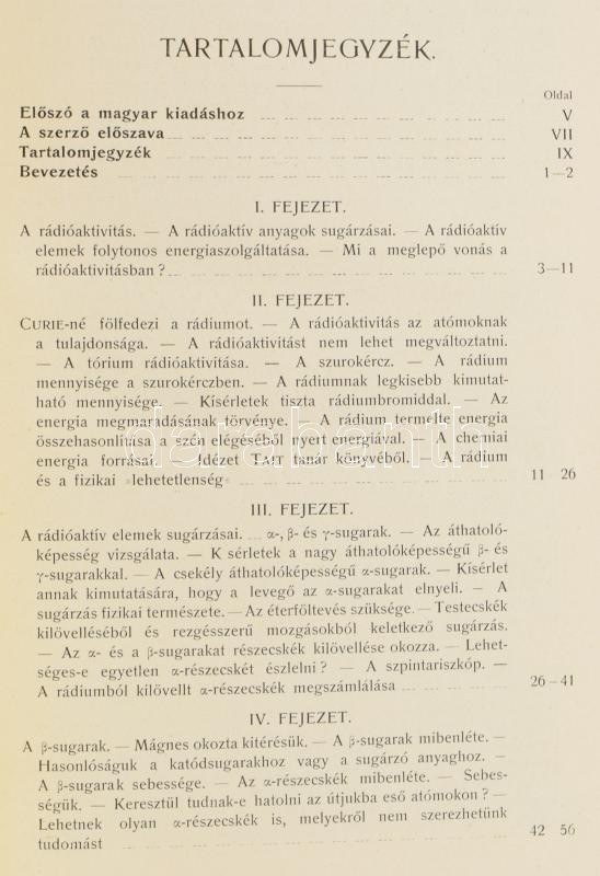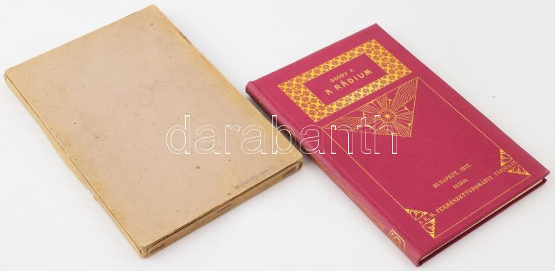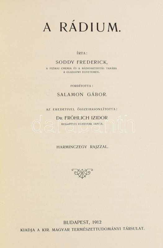 Soddy, F[rederick]: A rádium. Ford.: Salamon Gábor. Az eredetivel összehasonlította Frőhlich Izidor. Harmincegy rajzzal. Természettudományi Könyvkiadó-Vállalat LXXXVI. Bp., 1912, Kir. M. Természettudományi Társulat, ("Pátria"-ny.), XI+1+151 p. Kiadói szecessziós aranyozott egészvászon-kötés, kiadói kartontokban, rendkívül szép, szinte makulátlan állapotban, szuggesztíven csillogó aranyozással.