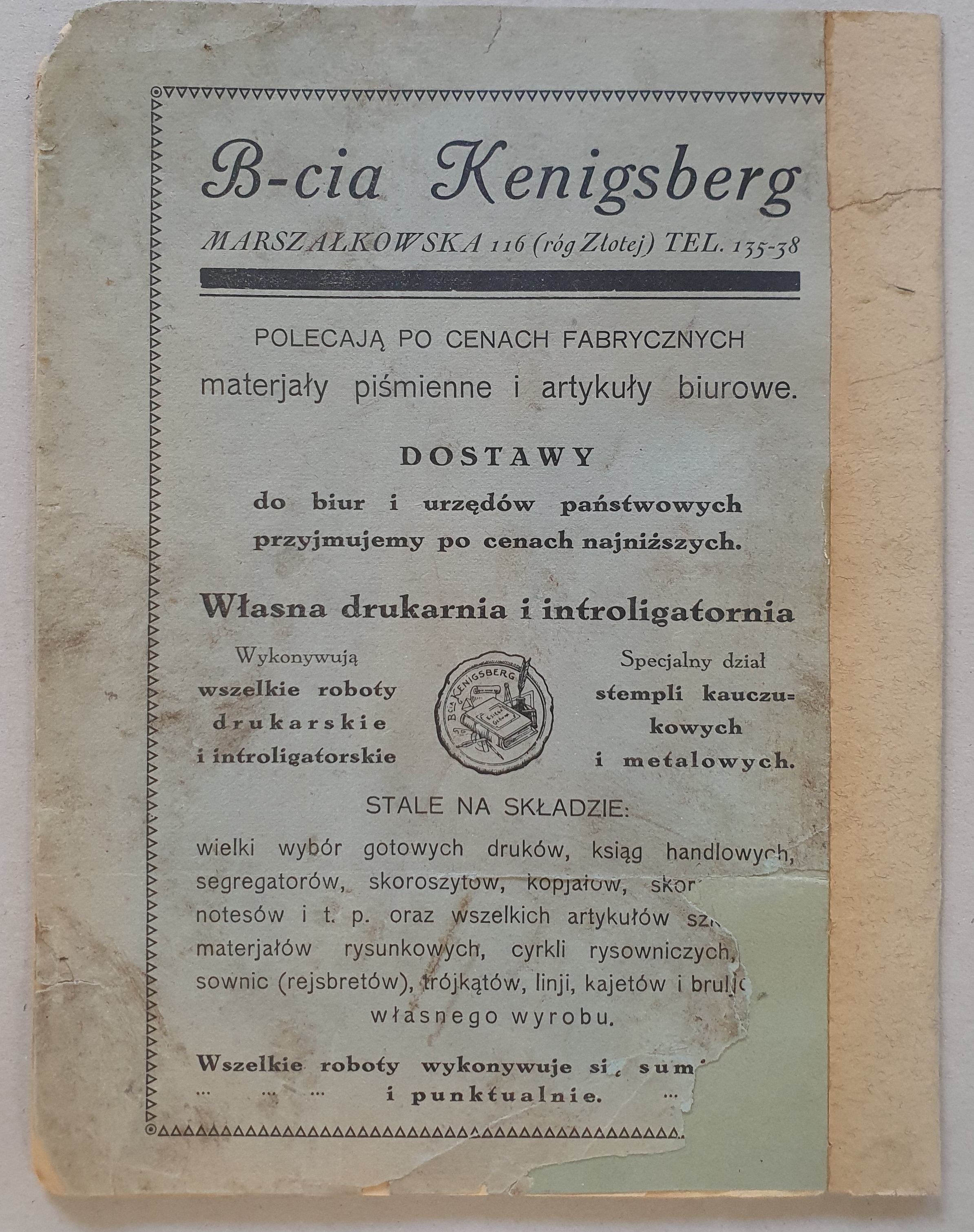 Nakładem i drukiem B-ci Kenigsberg, Warszawa, Marszałkowska 116, tel. 35-38.