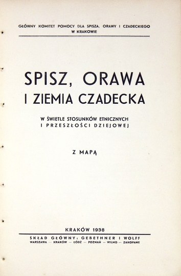 SPISZ, Orawa i Ziemia Czadecka w świetle stosunków etnicznych i przeszłości dziejowej. Z mapą. Kraków 1938. Główny Komitet Pomocy dla Spisza, Orawy i Czadeckiego. 8, s. 42, [1], mapa 1. brosz.