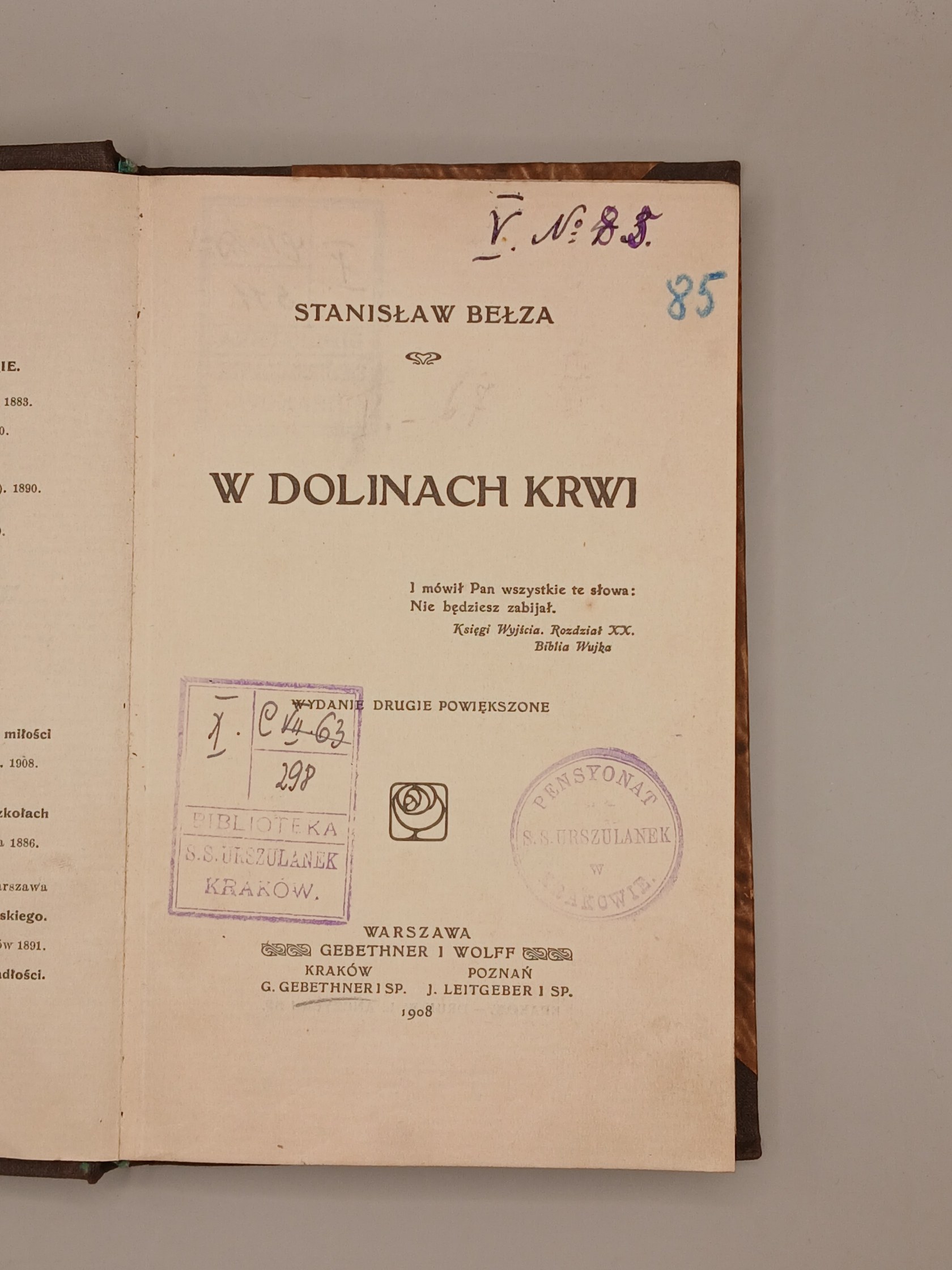 STANISŁAW BEŁZA. W DOLINACH KRWI. WYDANIE DRUGIE POWIĘKSZONE. WARSZAWA 1908, Gebethner i Wolff. 18,5x12 cm, s. 182, [2], oprawa twarda półpłótno.  Stare pieczęcie własnościowe i wpisy inwentarzowe, poza tym stan więcej niż dobry.