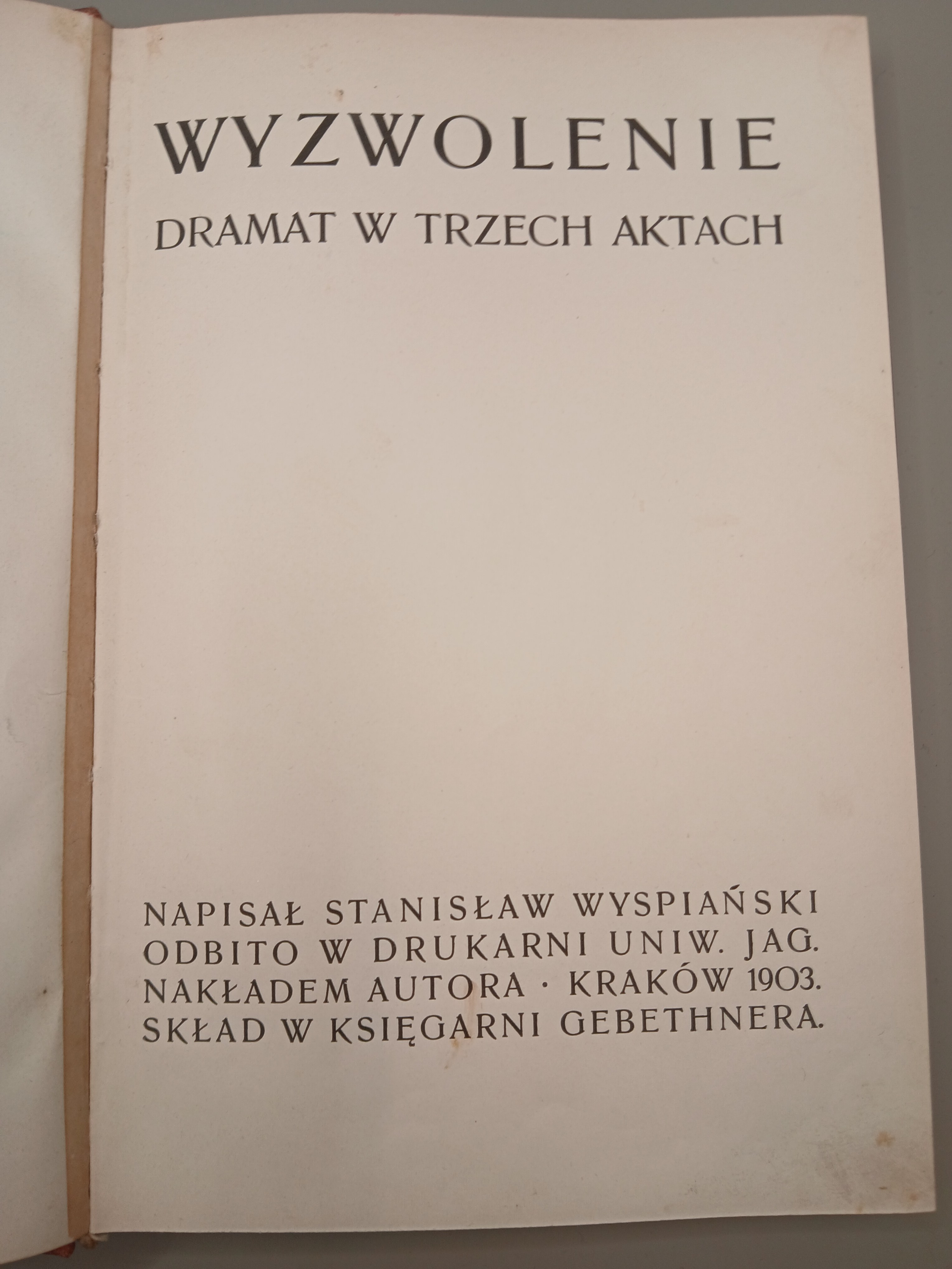 STANISŁAW WYSPIAŃSKI. WYZWOLENIE DRAMAT W TRZECH AKTACH. KRAKÓW 1903. NAKŁADEM AUTORA, ODBITO W DRUKARNI UNIW. JAG., SKŁAD W KSIĘGARNI GEBETHNERA. s. 194, [4], 21x14cm, oprawa pełne płótno.