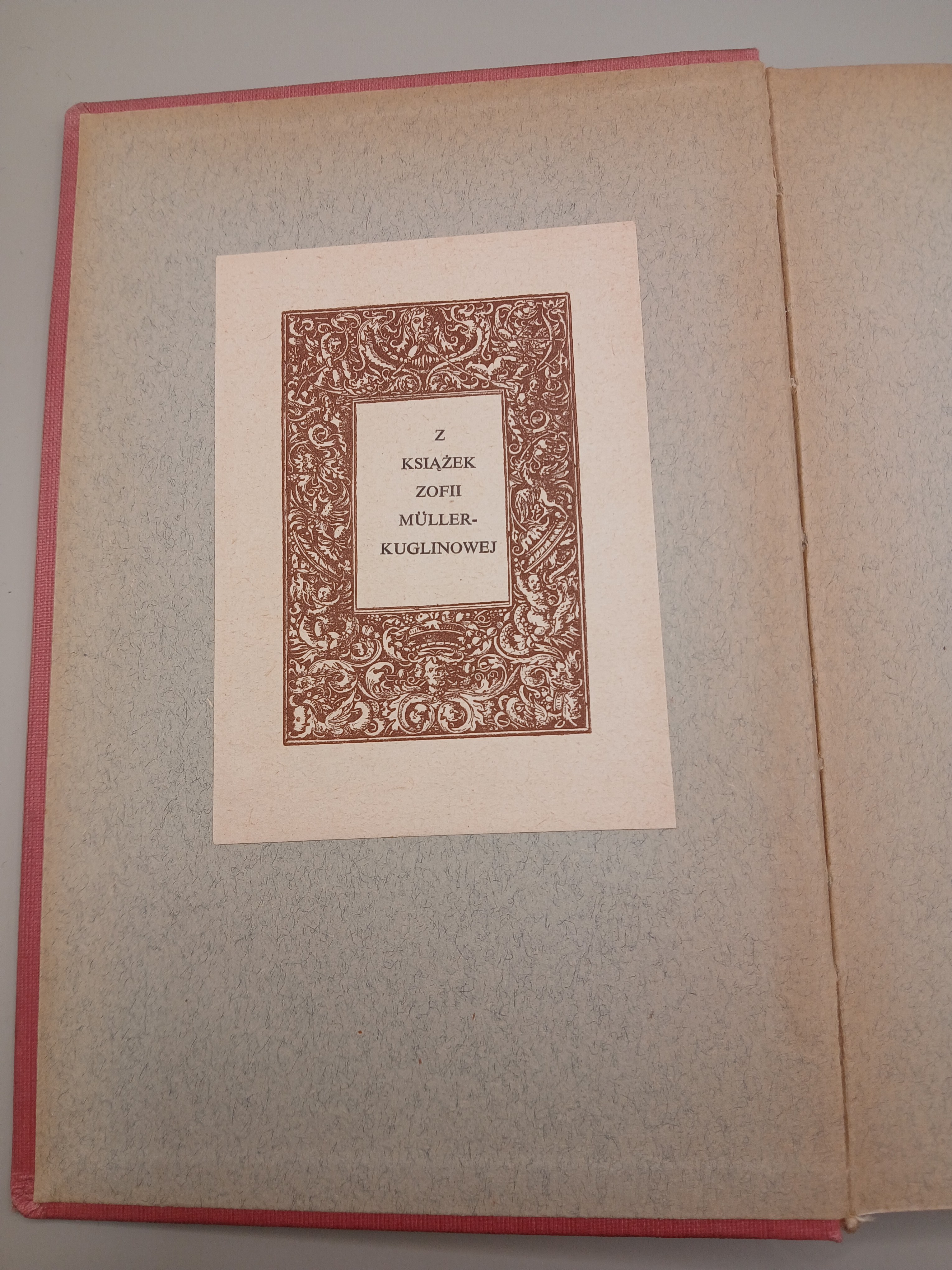 Monogram na grzbiecie (C.S.) i ekslibris Zofii Muller-Kuglinowej (aktorki?? teatrów w Zakopanem, Łodzi,Krakowie, Wilnie i Grodnie) na wewnętrznej stronie okładki, barwione górne brzegi kart. Stan dobry.