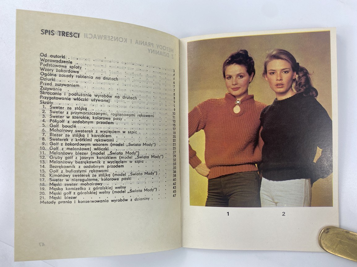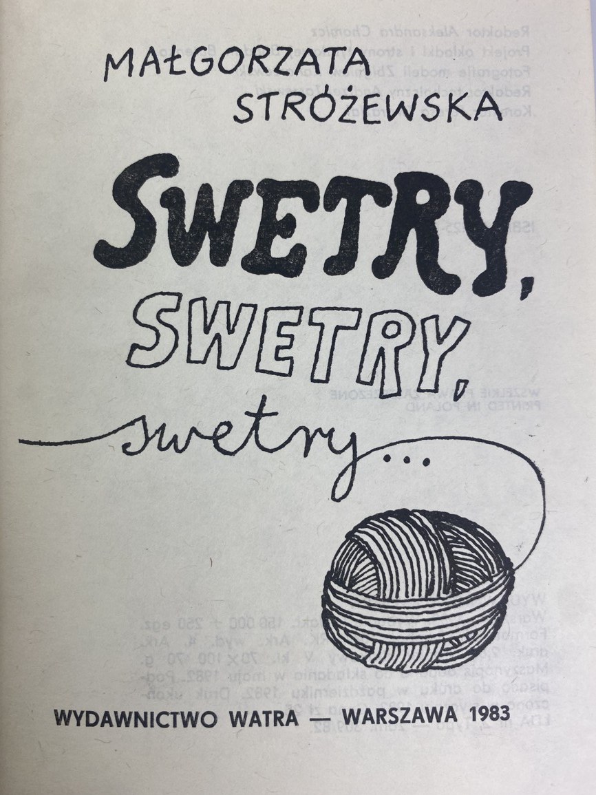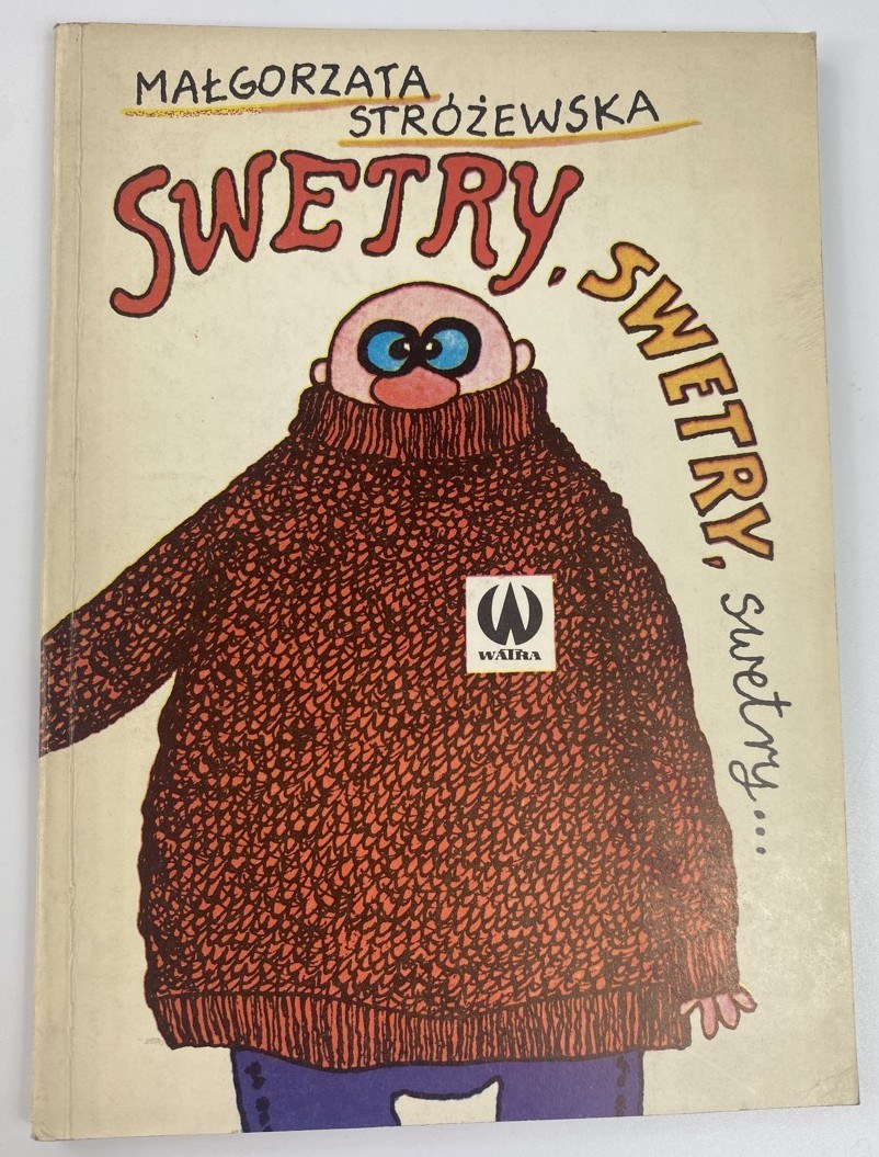 Stróżewska Małgorzata, Swetry, swetry, swetry..., "Watra", Warszawa 1983, s. 47, [1], [16] s. tabl. kolor., wymiary 12 x 16,5 cm. Projekt okładki i strony tytułowej Bohdan Butenko. Okładka broszurowa, wydawnicza. Niewielkie zabrudzenia okładki.