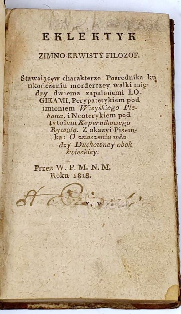 "Kiedy w r. 1810 ukazała się broszurka: O znaczeniu władzy duchownej obok świeckiej – ogłoszona w Nr. 48, 49, 50, 52, 53 "Gazety Korrespondenta Warszawskiego" 1817 przez P. S. (czyżby Potocki Stanisław?), w której autor dowodził wyższości władzy świeckiej nad duchowną, odpowiedział Surowiecki broszurą: List prowincjonalnego do Warszawskiego Filozofa – w Wilnie 1817, zbijając błędy, w tamtej broszurze zawarte, a w następnym roku ogłosił książkę: Eklektyk zimnokrwisty Filozof stawający w charakterze Pośrednika ku ukończeniu morderczej walki między dwiema zapalonymi Logikami: Perypatetykiem pod imieniem Wiejskiego Plebana, i Neoterykiem pod tytułem "Kopernikowego Rywala". Przez W. P. M. N. N. Roku 1818; książka zajmuje się odparciem tezy, że władza świecka wyższa od duchownej..." Źródło: ultramontes.pl