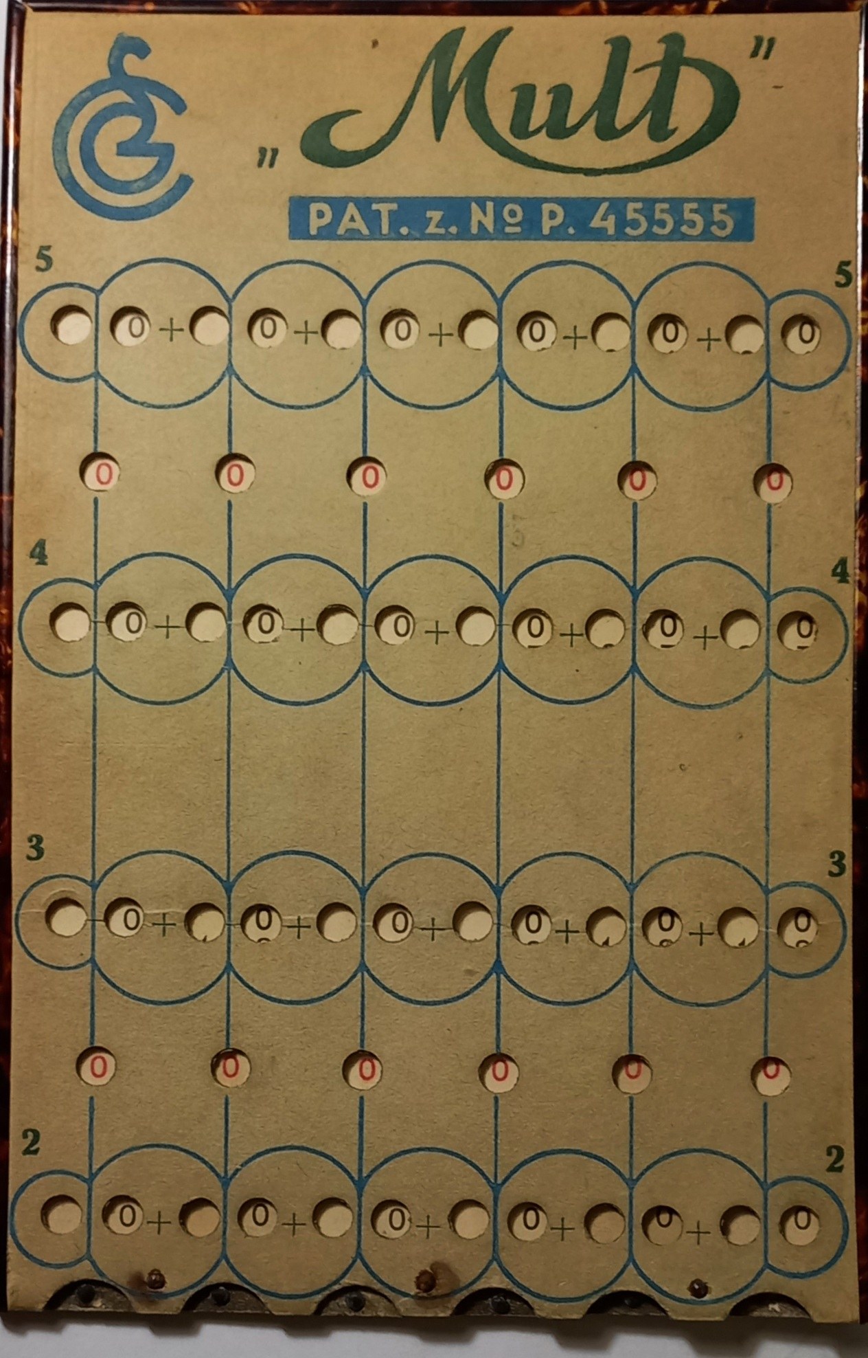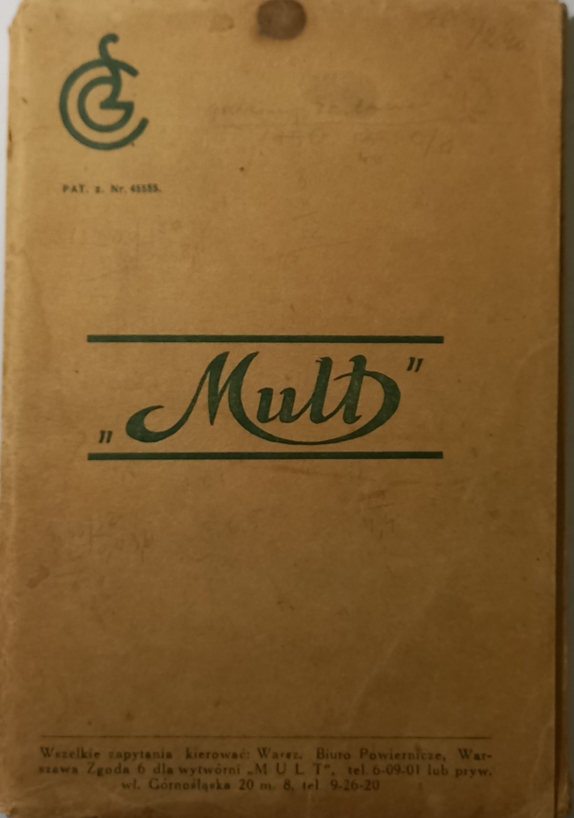 Suwak "MULT" [opatentowany arytmometr Pat. No P. 4555] służący do momentalnego mnożenia (dzielenia) dowolnej liczby wielocyfrowej..., obliczania procentów, wraz z 2. objaśnieniami uproszczonego mnożenia i dzielenia, Wytwórnia Warszawa, u. Zgoda 6, ok. 1930, suwak sprawny, bez uszkodzeń,