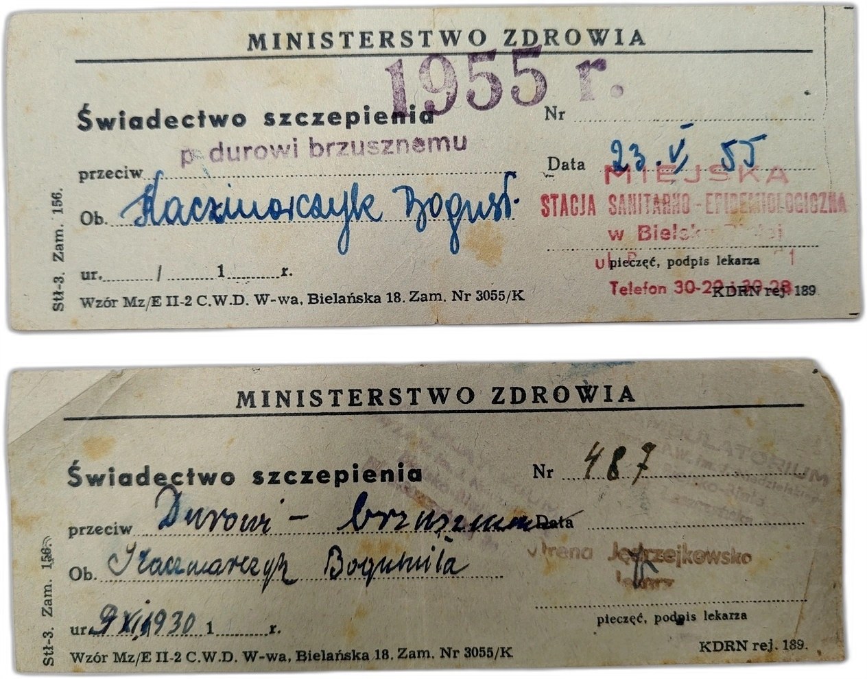 Świadectwo szczepienia na dur brzuszny, Bielsko Biała 1955
