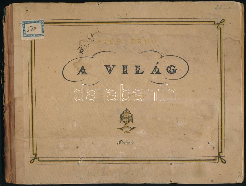 Szép Ernő: A világ. Versek. Bécs, 1921., Szerzői, (Johann N. Vernay-ny.). 63+ 1 p. Első kiadás. Kiadói haránt-alakú félvászon-kötés, kopott, foltos borítóval, sérült gerinccel.
