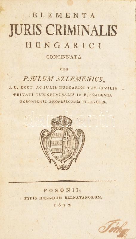 [Szlemenics Pál (1783-1856)] Szlemenics, Paulum: Elementa juris criminalis Hungarici. Posonii [Pozsony], 1817., Typis Haeredum Belnayanorum, 232 + 6+2 (errata) p. Első kiadás. Kiadói kopott kartonált papírkötés, a hátsó szennylapon és hátsó kötéstáblán egykorú bejegyzéssel.