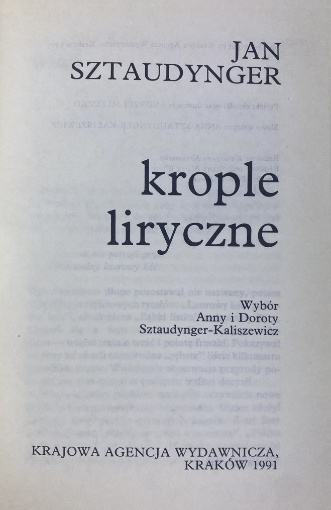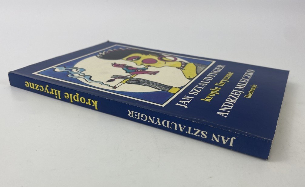 Sztaudynger Jan, Krople liryczne, Krajowa Agencja Wydawnicza, Kraków 1991, s. 229, [2], wymiary 13 x 19,5 cm. Wybór Anny i Doroty Sztaudynger-Kaliszewicz ; il. Andrzej Mleczko ; słowo wstępne A. Sztaudynger-Kaliszewicz. Okładka broszurowa, wydawnicza. Niewielkie otarcia okładki.