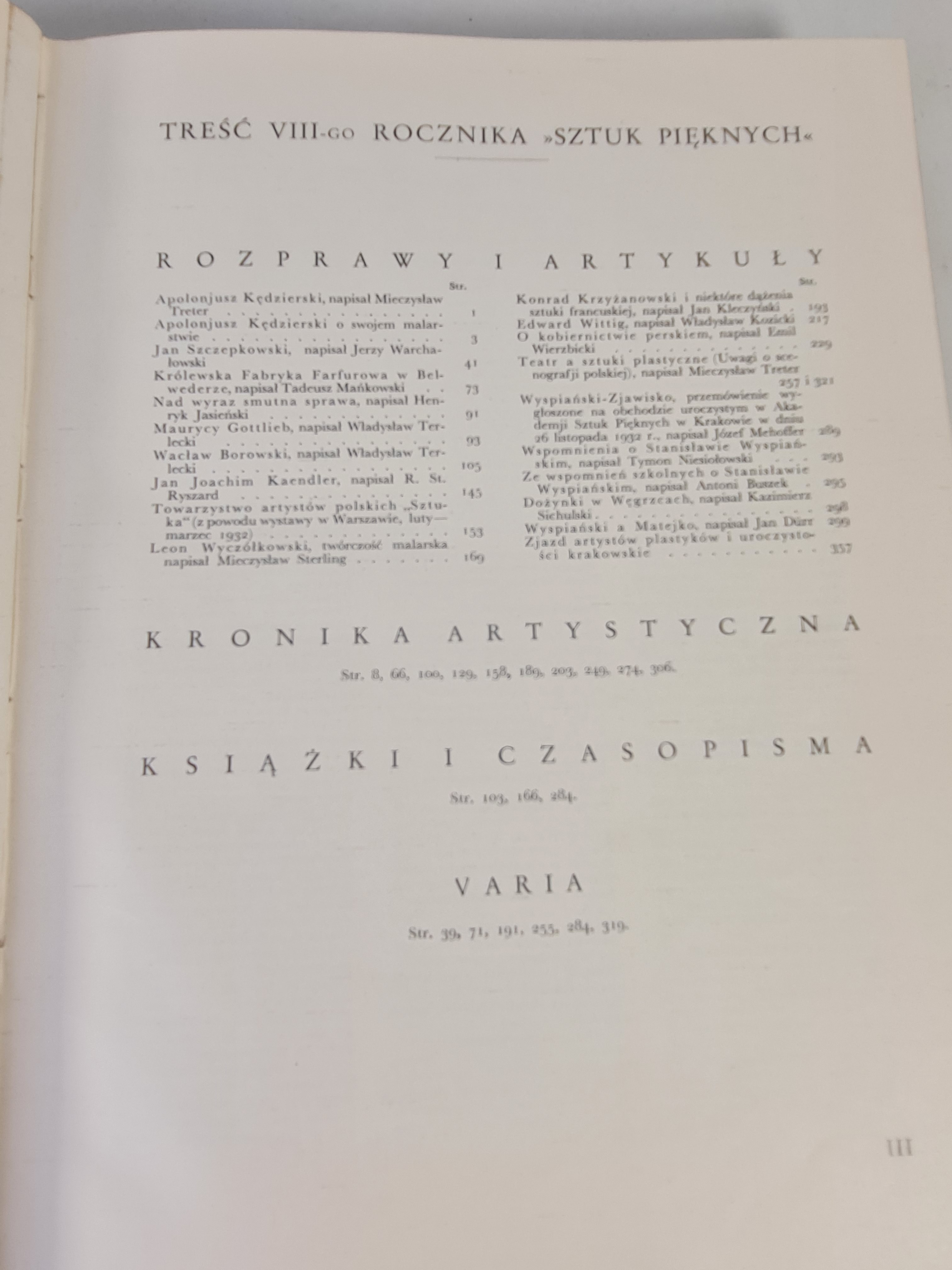 Treść: Rozprawy i artykuły: - Apolonjusz Kędzierski, napisał Mieczysław Treter - Apolonjusz Kędzierski o swojem malarstwie - Jan Szczepkowski, napisał Jerzy Warchałowski - Królewska Fabryka Farfurowa w Belwederze, napisał Tadeusz Mańkowski - Nad wyraz smutna sprawa, napisał Henryk Jasieński - Maurycy Gottlieb, napisał Władysław Trelecki - Wacław Brorowski, napisał Władysław Trelecki - Jan Joachim Kaendler, napisał R. St. Ryszard - Towarzystwo artystyów polskich "Sztuka" - Leon Wyczółkowski, twórczość malarska napisał Mieczysław Sterling - Konrad Krzyżanowski i niektóre dążenia sztuki francuskiej, napisał Jan Kleczyński - Edward Wittig, napisał Włądysław Kozicki - O kobiernictwie perskim, napisał Emil Wierzbicki - Teatr a sztuki plastyczne, napisał Mieczysław Treter i inne.