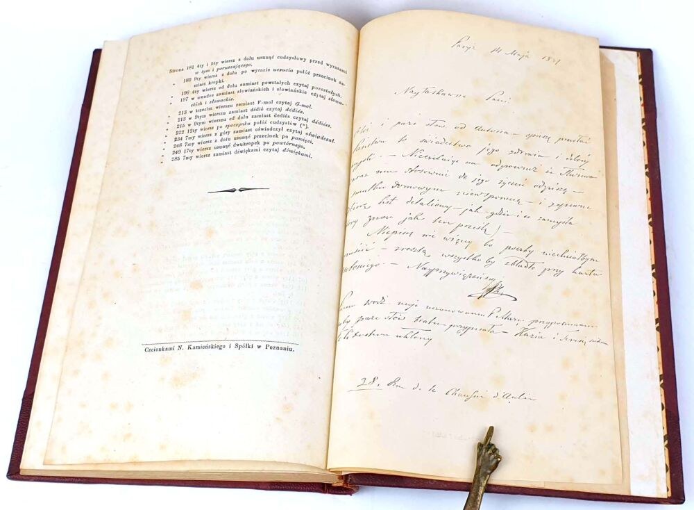 Poznań 1873, Nakładem Księgarni Jana Konstantego Żupańskiego, str. 293,[3], portret (drzeworyt), facsim. 2 (w tym jedno rozkł.); format 14x22,5cm