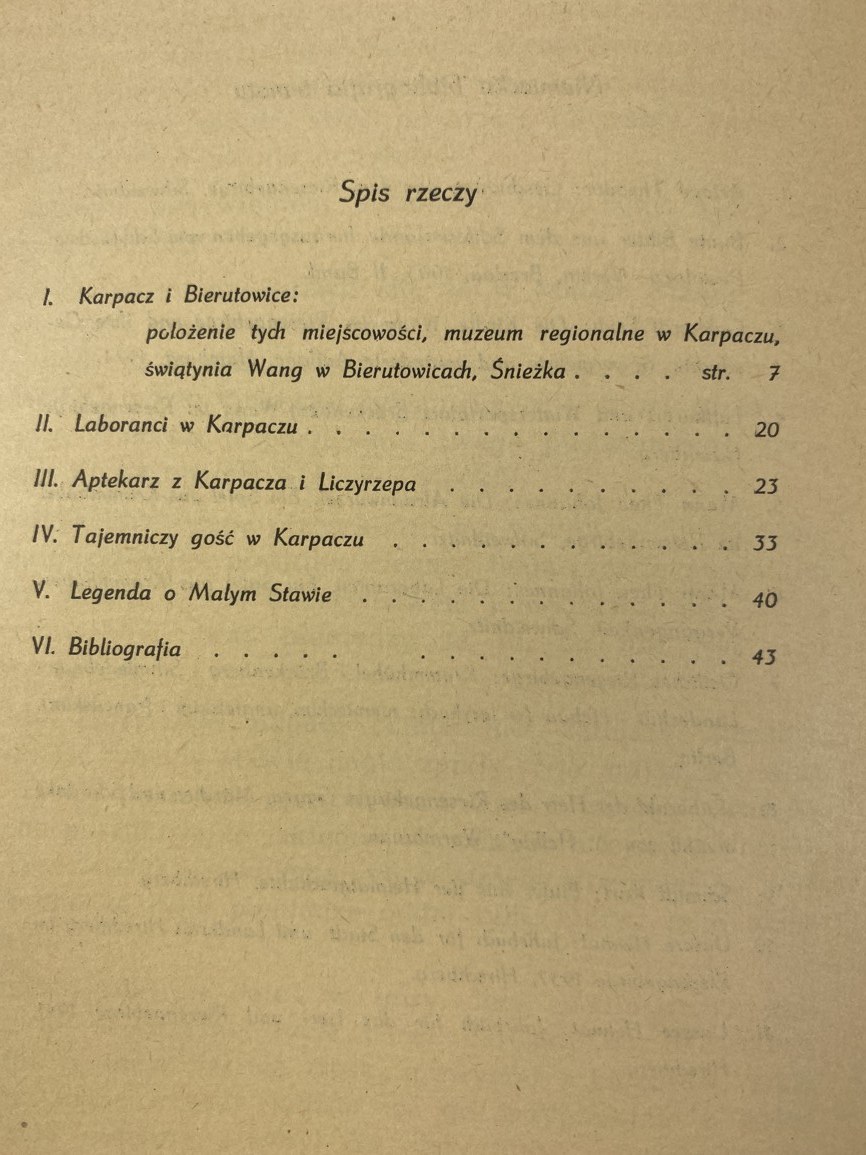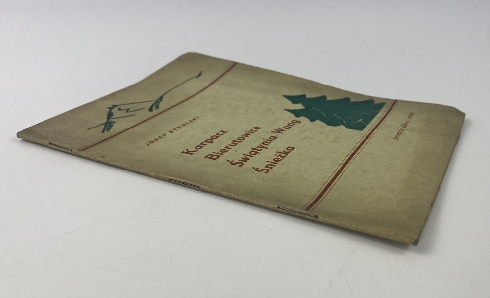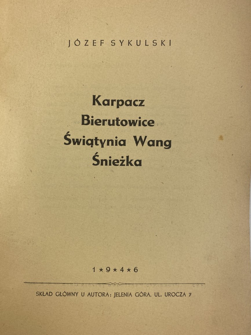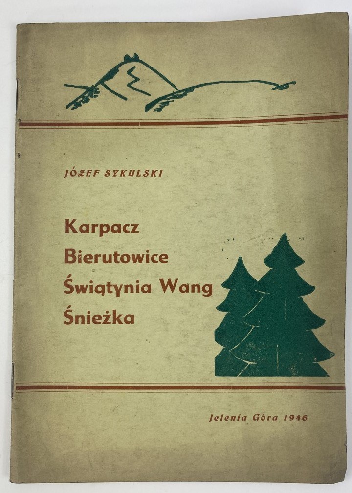 Szykulski Józef, Karpacz, Bierutowice, Świątynia Wang, Śnieżka, nakład autora, Jelenia Góra 1946, s. 43, wymiary 15 x 20,5 cm. Ilustracje w tekście. Okładka broszurowa, wydawnicza. Zabrudzenia, niewielkie otarcia okładki.