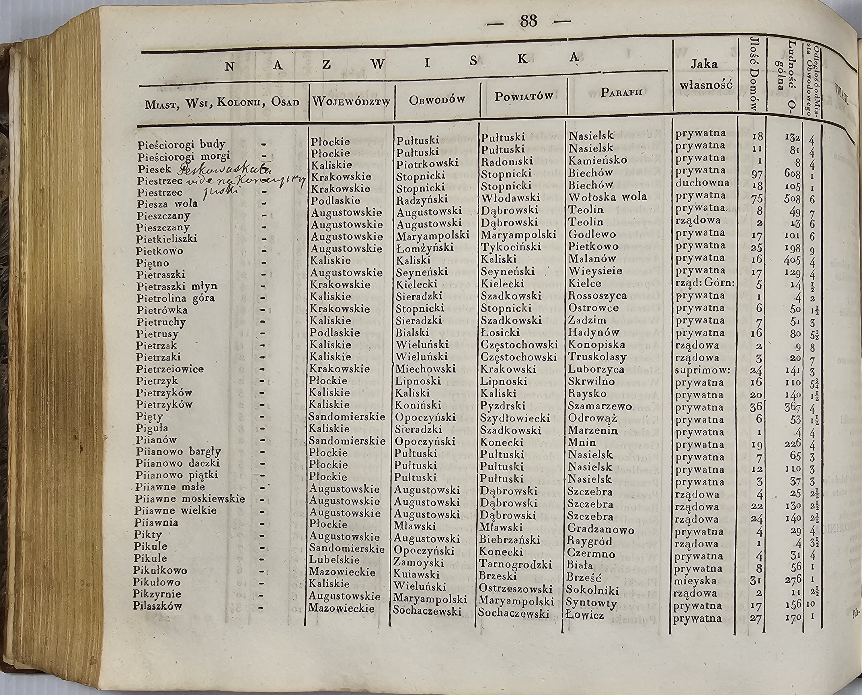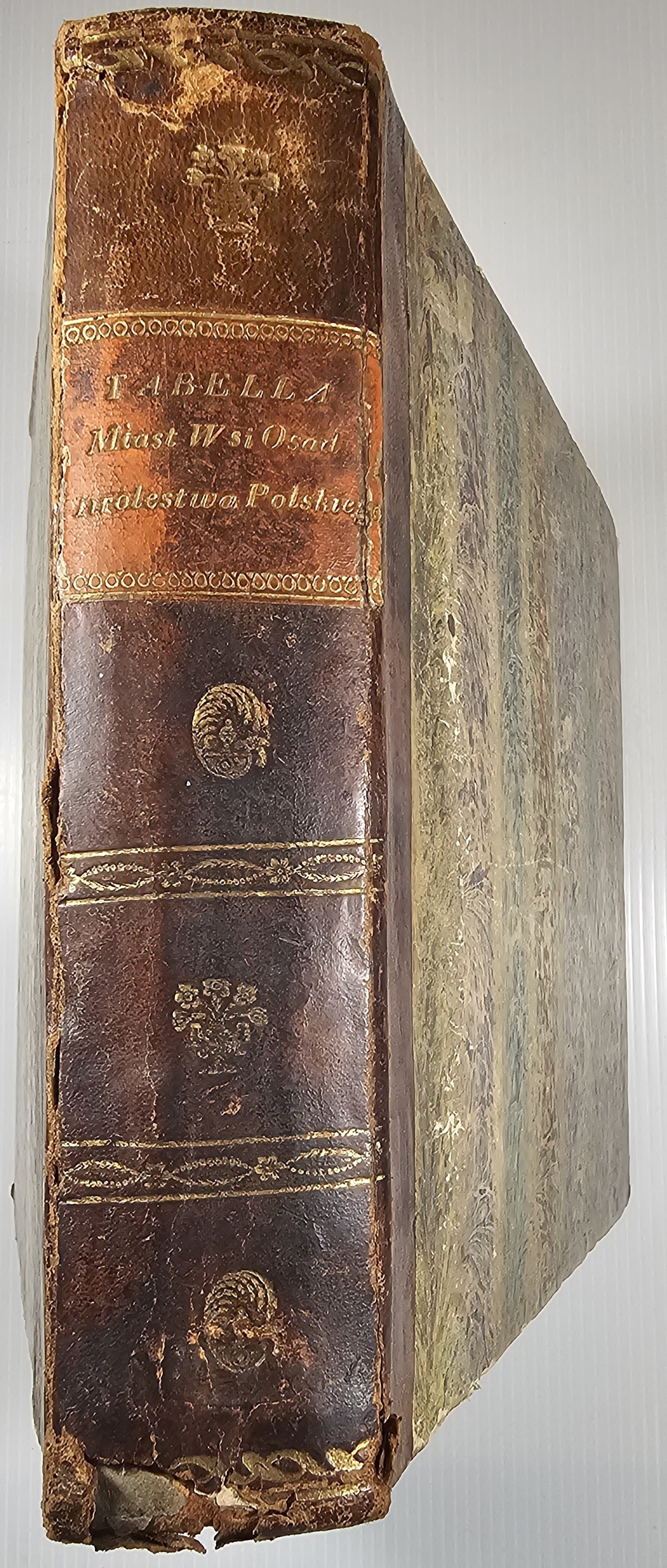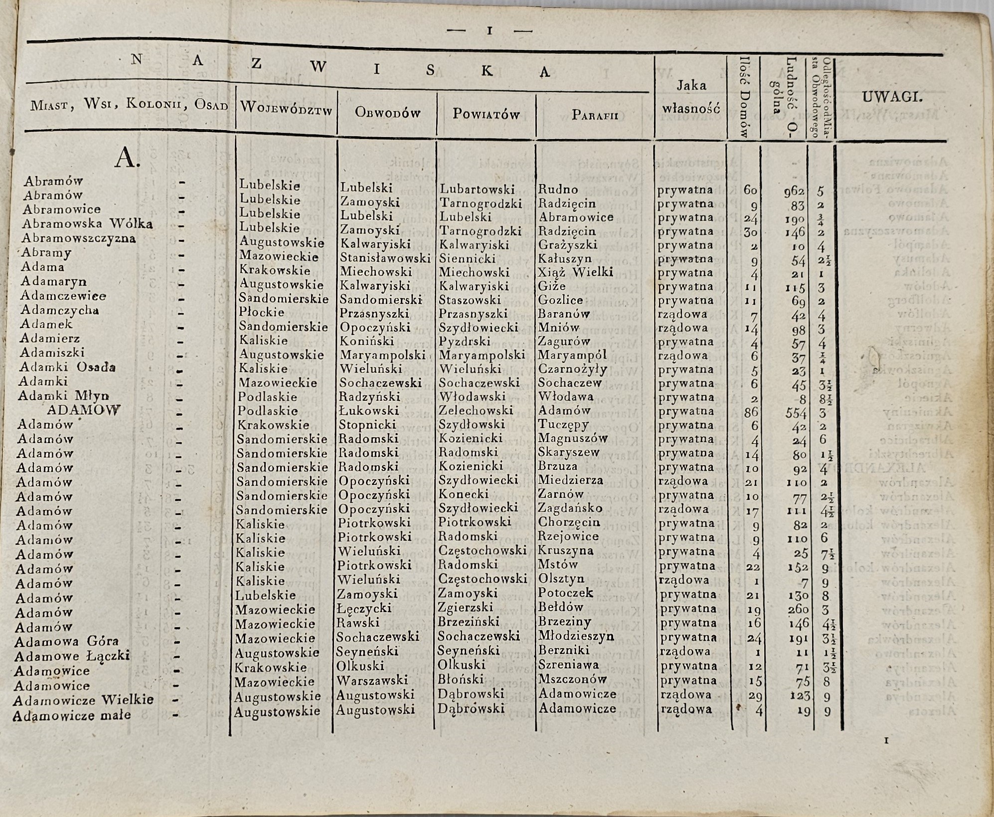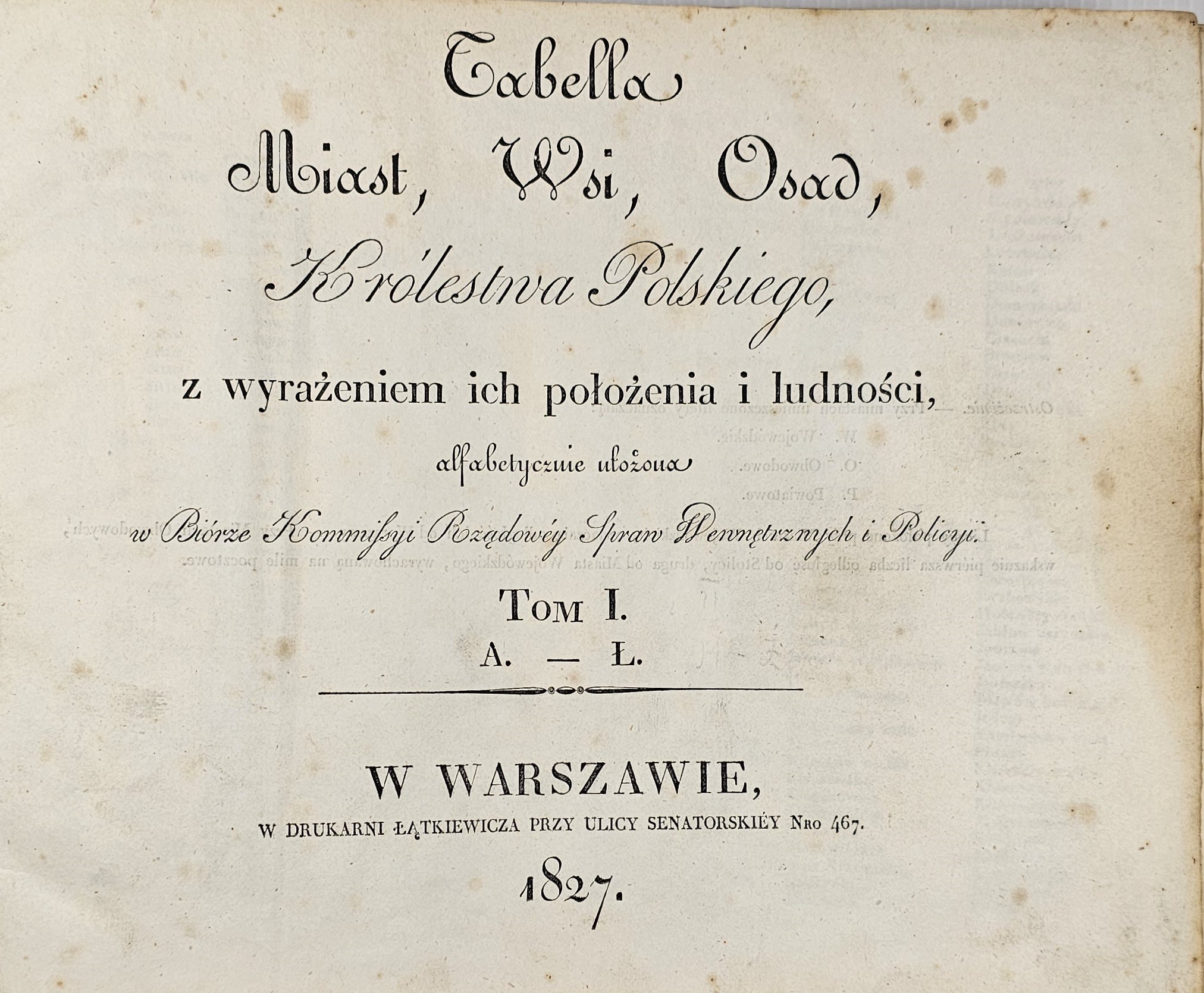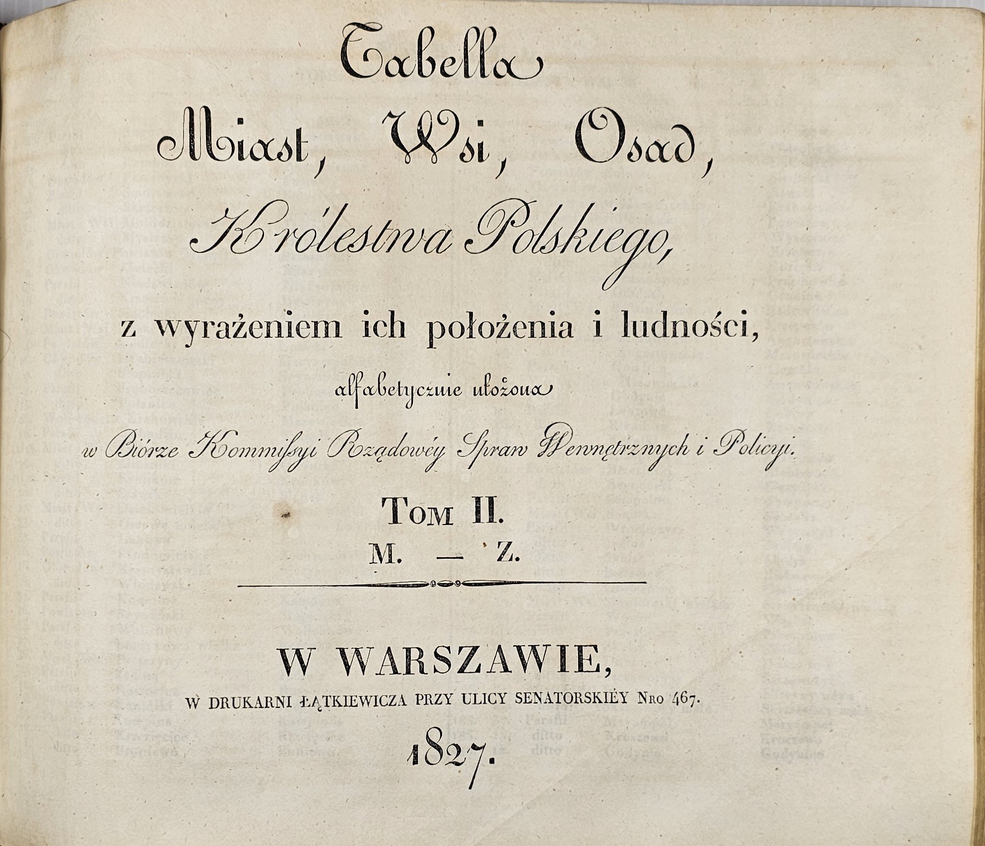 8podłuż., k. [3], paginacja dublowana: k. 72, [1], [2], 85 , [13] kart pustych z odr. narysowanymi tabelkami; opr. psk. w 1 wol. z epoki. Stan dobry. Pełny tytuł: Tabella Miast, Wsi, Osad, Królestwa Polskiego, z wyrażeniem ich położenia i ludności, alfabetycznie ułożona w Biórze Kommissyi Rządowj Spraw Wewnętrznych i Policyi. T.1: A.-Ł. T.2: M.-Z.