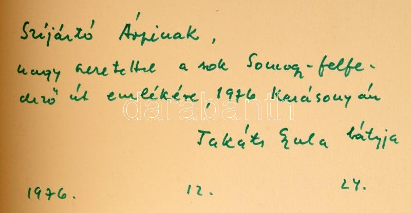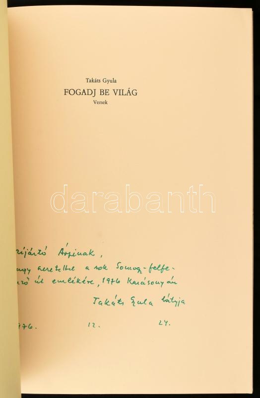 Takáts Gyula: Fogadj be világ. Versek. A költő rajzaival illusztrált. Békéscsaba, 1983., Megyei Könyvtár, 5 sztl. lev. Első kiadás. Kiadói papírkötés. Számozott (3./250), a szerző, Takáts Gyula 1911-2008) Kossuth-díjas költő, író, műfordító, kritikus,múzeumigazgató által Szíjártó Árpád somogyi költő részére dedikált példány.