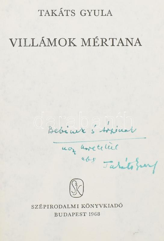 Takáts Gyula: Villámok mértana. Bp., 1968., Szépirodalmi. Első kiadás. Kiadói egészvászon-kötés, kiadói papír védőborítóban, jó állapotban. A szerző, Takáts Gyula (1911-2008) Kossuth-díjas költő, író, által dedikált példány. + hozzá a szerző egy autográf dedikációval ellátott képeslapja