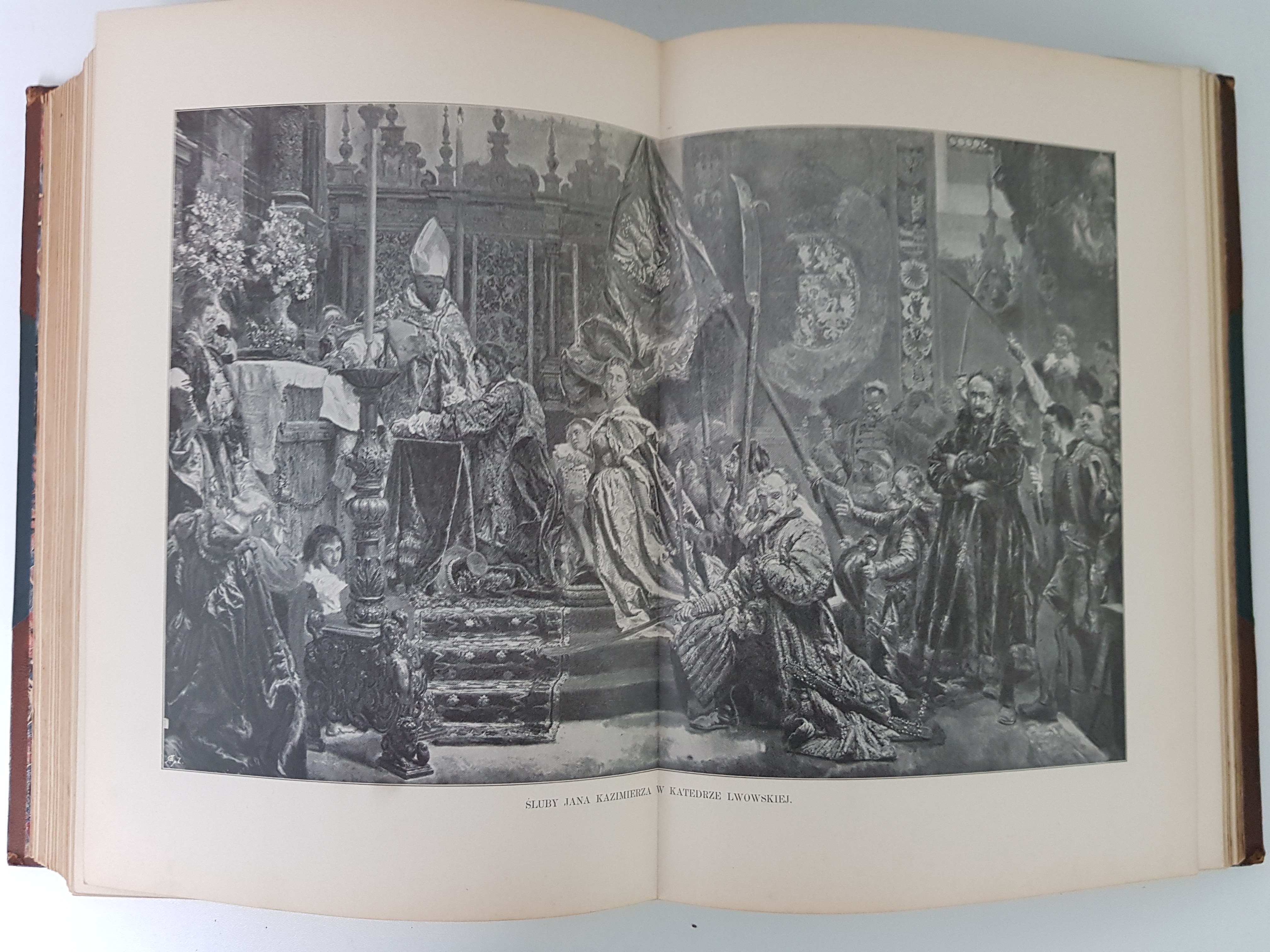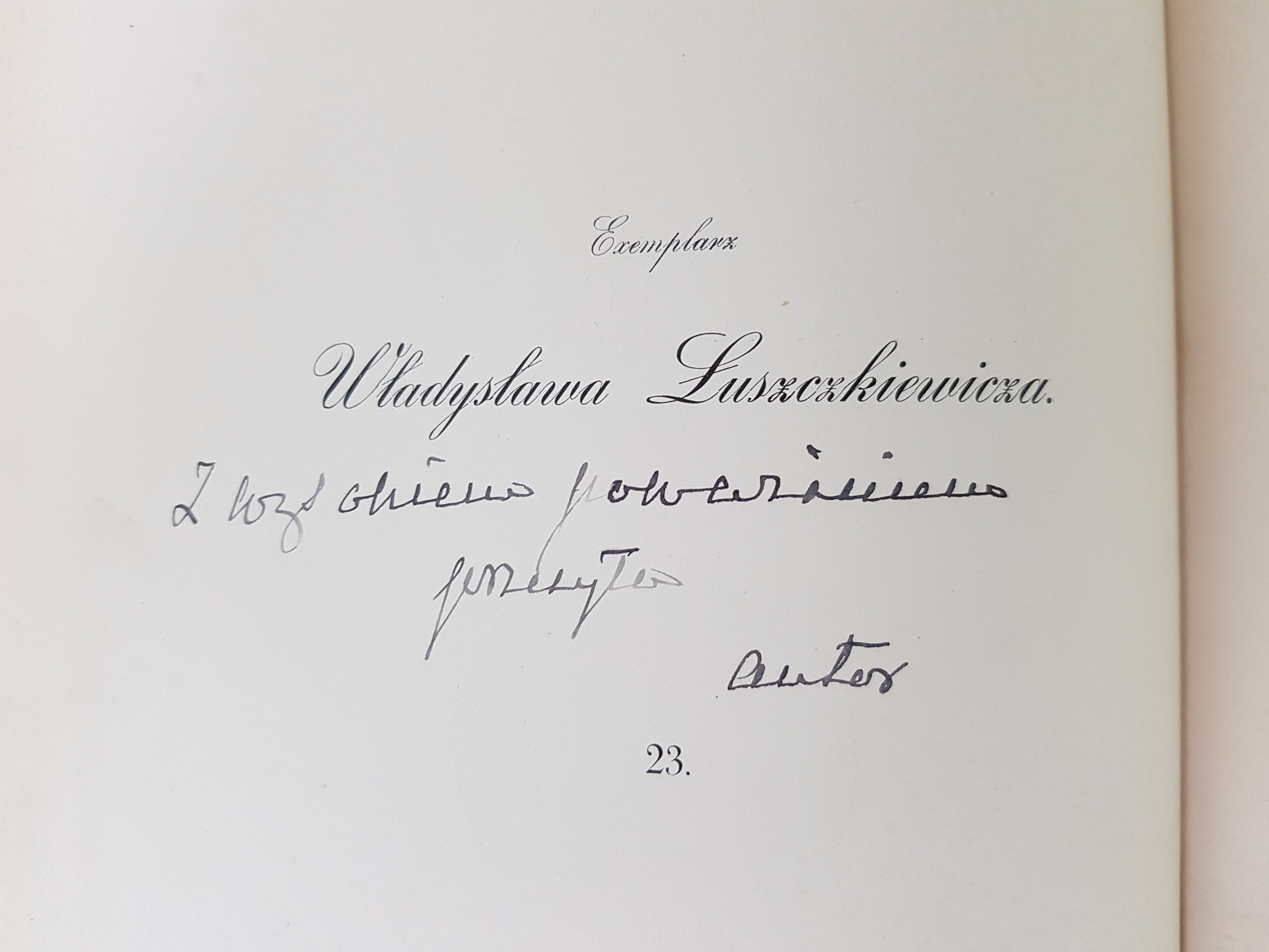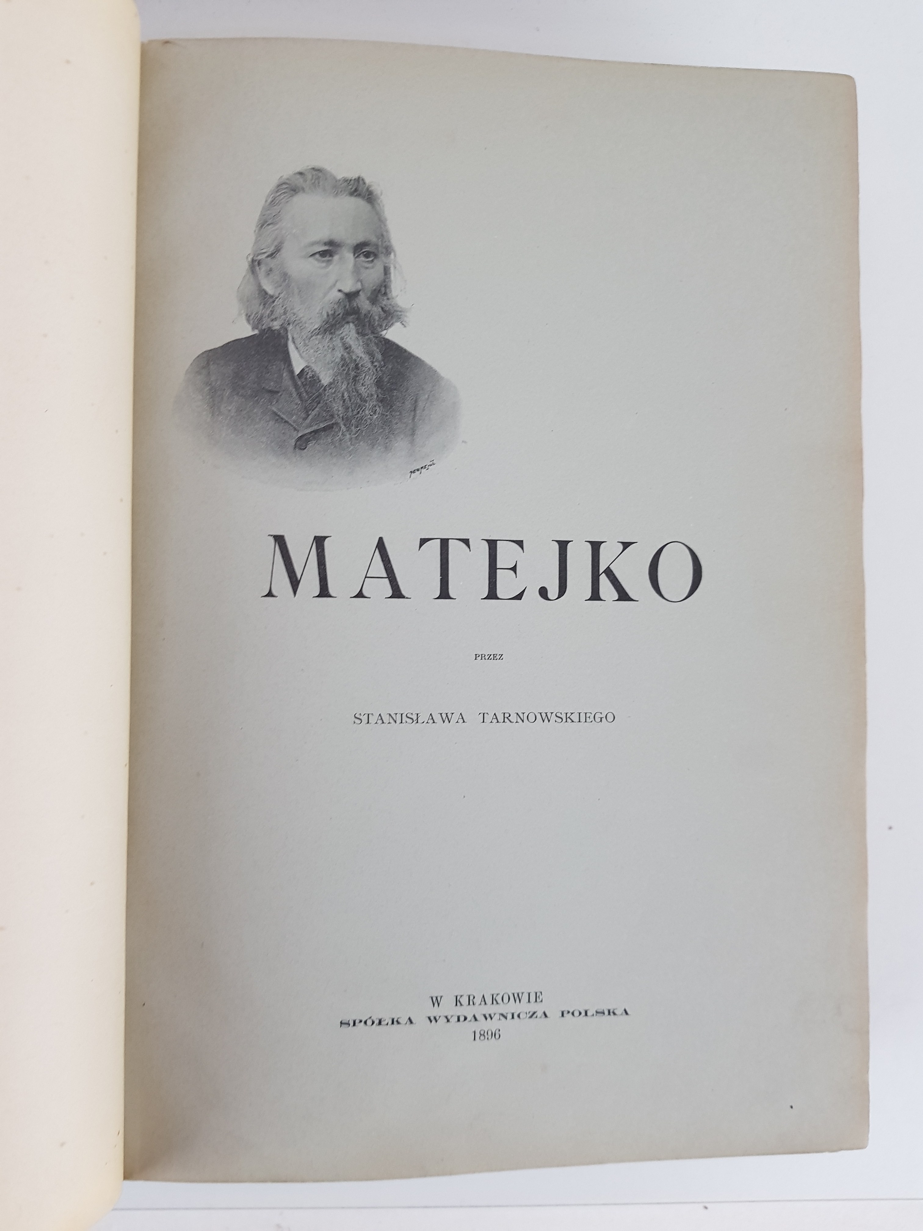 Kraków 1897. W Księg. Spółki Wydawniczej Polskiej. Egzemplarz Władysława Łuszczkiewicza z odręczną dedykacją Autora. Wym.28,2x21cm; stron 562. 4, s. [4], 562, 1 heliograwiura (portret Matejki), 22 tabl. z ilustracjami (w tym 12 skład.), ilustracje w tekście, okł. brosz. zachow., opr. psk. introligat. z epoki. Oprawa introligatorska: brązowy półskórek, złoc. napisy na grzbiecie, narożniki w skórze, wyklejki ozdobne(otarcia, przybrudzenia, zarysowania), niew. ślad zalania portretu i k. tyt., blok książki nieco poluźniony. Wklejony papierowy Exlibris na wyklejce. Stan dobry.