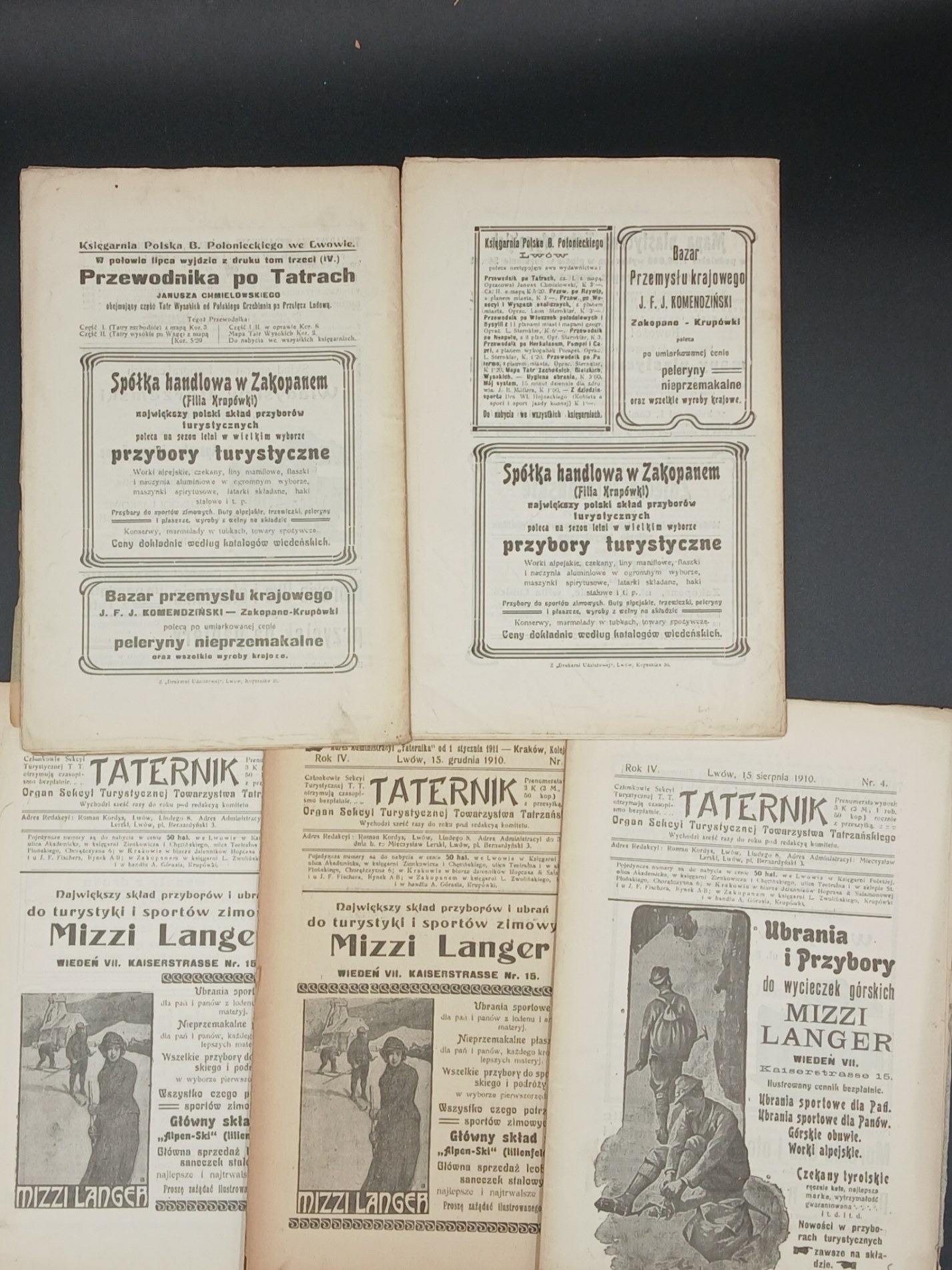 TATERNIK. Organ Sekcyi Turystycznej Towarzystwa Tatrzańskiego. Lwów 1910. Rok IV. Zeszyty 2-6, s. 25-44; 45-72; 73-92; 93-120; 121-140, zachowane oryginalne okładki broszurowe.