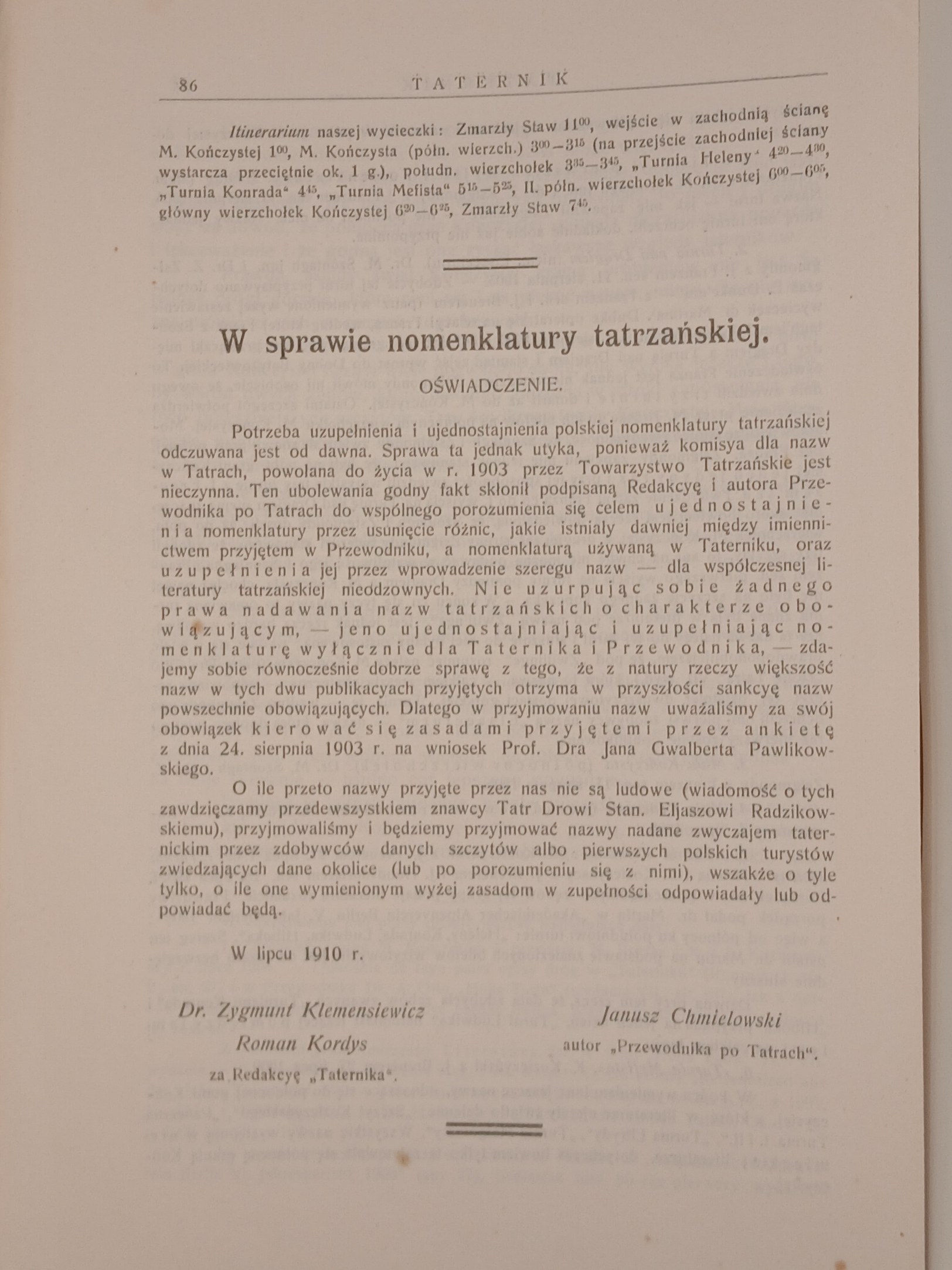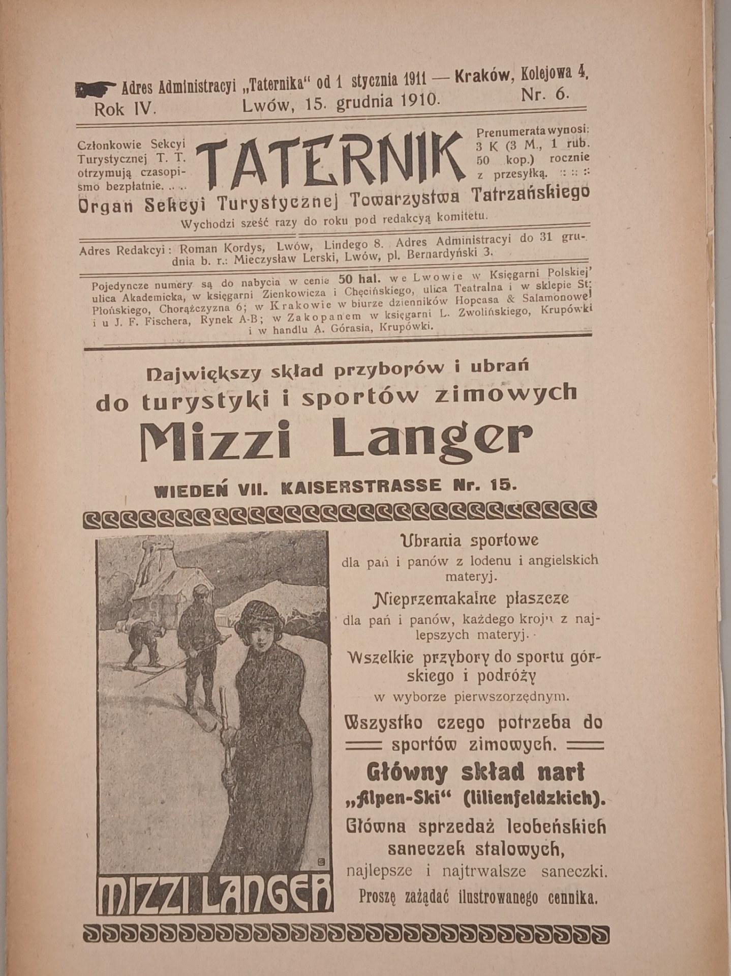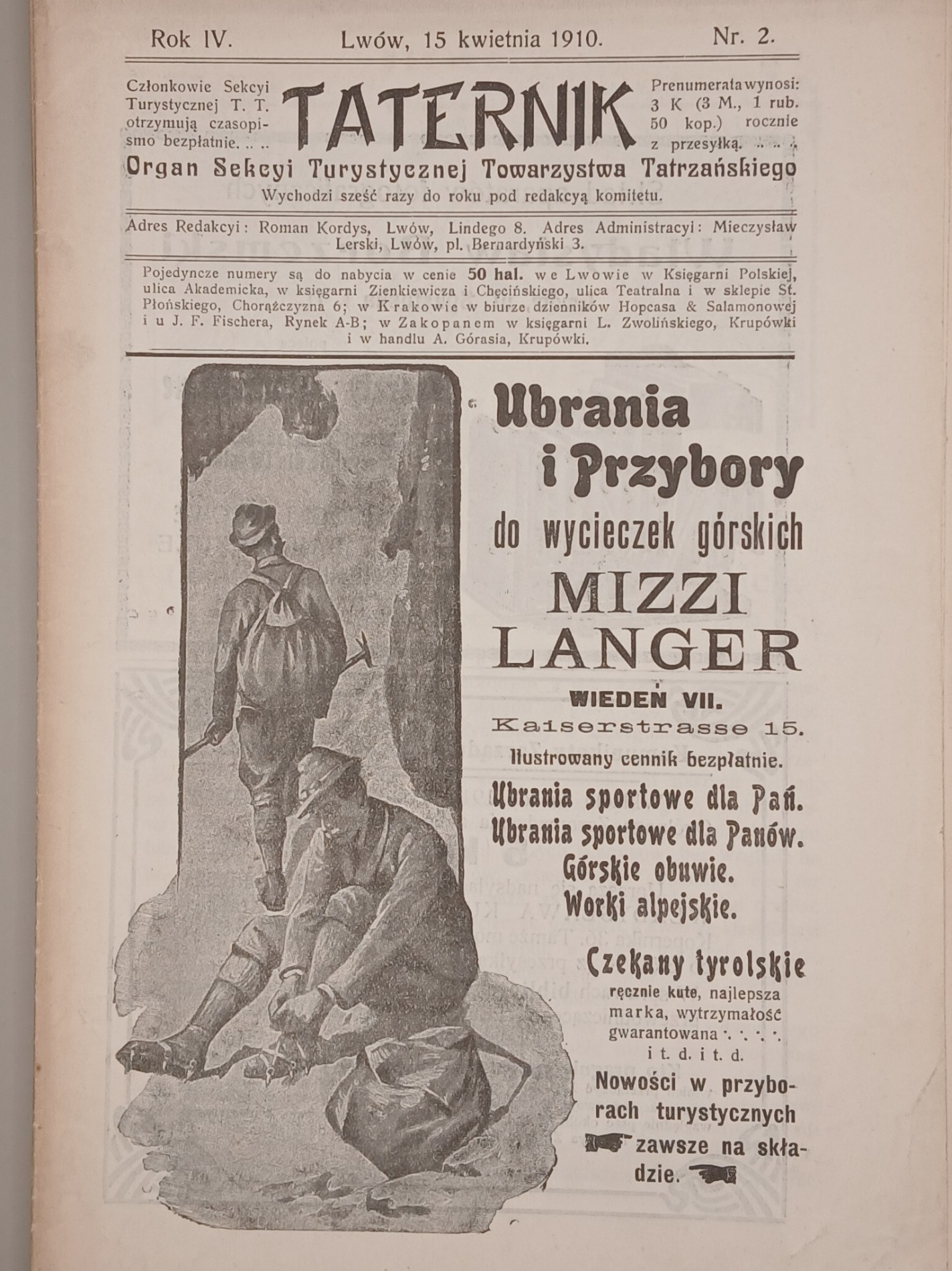 Czwarty rocznik legendarnego pisma ( niepełny, do kompletu brak nr. 1), wśród redaktorów i autorów prekursorzy taternictwa i narciarstwa, pierwsi zdobywcy szczytów i grani tatrzańskich. UNIKATOWE FOTOGRAFIE (w tym całostronicowe drukowane na osobnych kartach i papierze kredowym, przekładane bibułką), odnotowane nowe tatrzańskie drogi i wejścia, reklamy sprzętu alpinistycznego: górskie obuwie, worki alpejskie, czekany tyrolskie (ręcznie kute), głównych składów nart i leobeńskich saneczek stalowych.