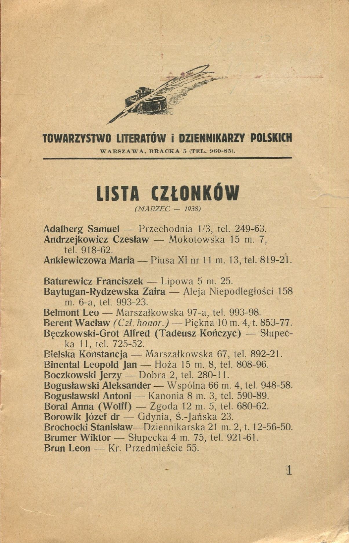 Spis członków Towarzystwa Literatów i Dziennikarzy Polskich (stan na marzec 1938), wraz z adresem ich zamieszkania (większość w Warszawie) i numerem telefonu.