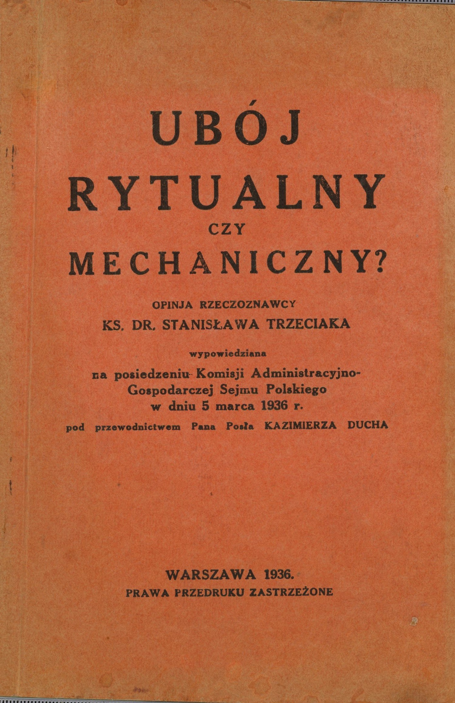 16d, s. 42, okł. oryg. Stan bardzo dobry. Opinia rzeczoznawcy Stanisława Trzeciaka wypowiedziana na posiedzeniu Komisji Administracyjno-Gospodarczej Sejmu Polskiego w dniu 5 marca 1936 r. pod przewodnictwem Kazimierza Ducha. Dedykowane "Obrońcom zwierząt z wezwaniem do wytrwania!" Treść: Rzut oka na ubój rytualny. Zakaz używania krwi. Czy ubój rytualny ma religijny charakter. Humanitarność uboju rytualnego.