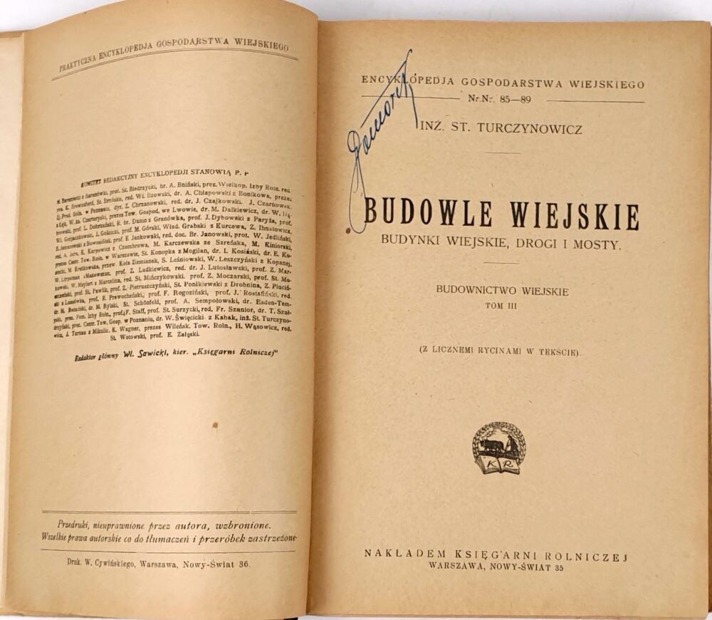 Budowle wiejskie. Budynki wiejskie, drogi i mosty. Budownictwo Wiejskie Tom III (z licznymi rycinami w tekście). Encyklopedja Gospodarstwa Wiejskiego. Nr 85-89