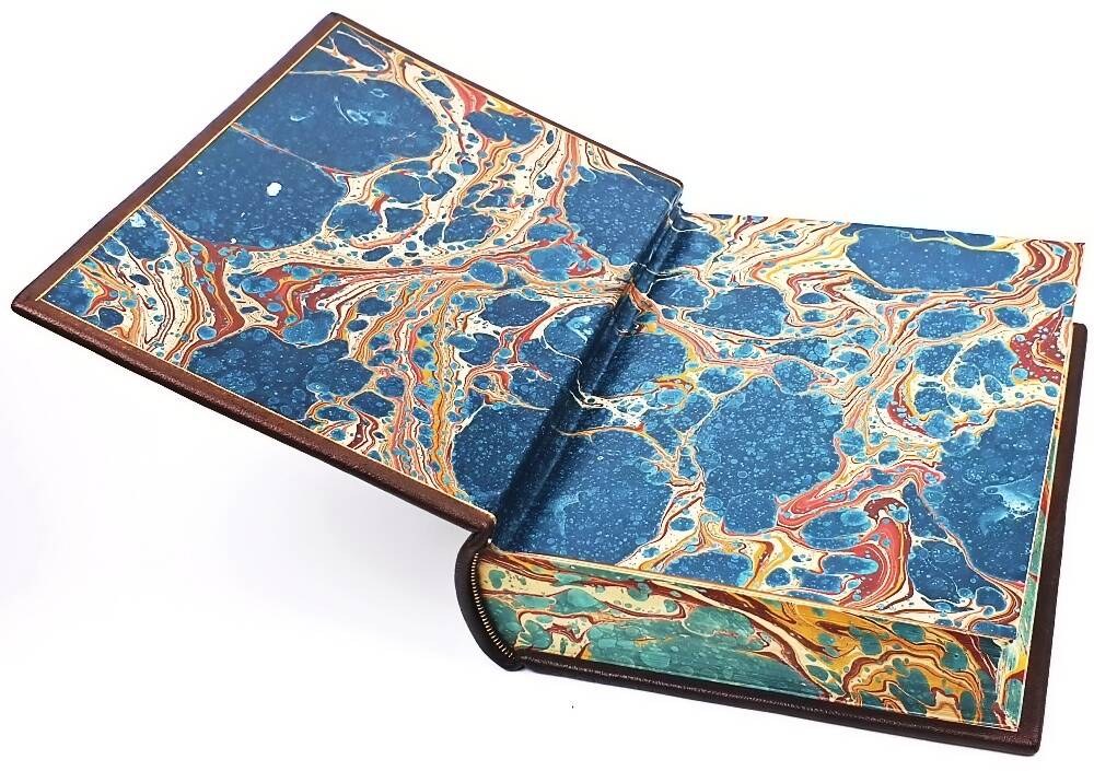 TWARDA OPRAWA PEŁNA SKÓRA. WSPÓŁCZESNA OKŁADKI OKOLONE TŁOCZENIAMI, GRZBIET Z WYPUKŁYMI ZWIĘZAMI I ZŁOCENIAMI. RĘCZNIE BARWIONY W MASIE PAPIER MARMORYZOWANY NA WYKLEJKACH, WSZYSTKIE OBCIĘCIA KART MARMORYZOWANE W TEN SAM SPOSÓB.
