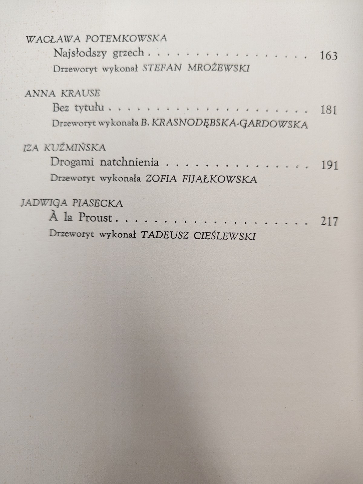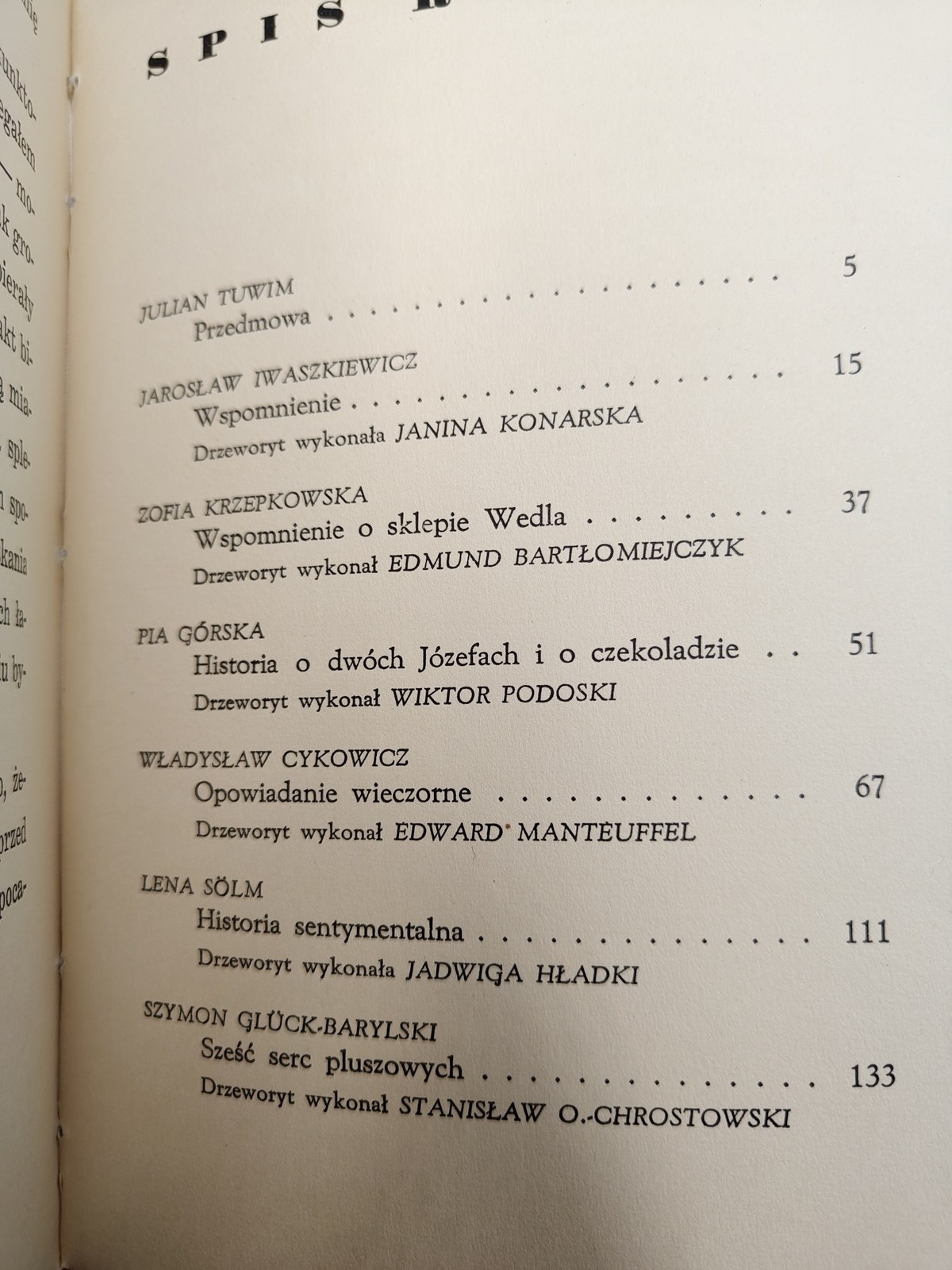 W treści: Wstęp (Julian Tuwim). Wspomnienie (Jarosław Iwaszkiewicz, drzeworyt - Janina Konarska). Wspomnienie o sklepie Wedla (Zofia Krzepkowska, drzeworyt - Edmund Bartłomiejczyk). Historia o dwóch Józefach i o czekoladzie (Pia Górska, drzeworyt - Wiktor Podolski). Opowiadanie wieczorne (Władysław Cykowicz, drzeworyt - Edward Manteuffel). Historia sentymentalna (Lena Sölm, drzeworyt - Jadwiga Hładki). Sześć serc pluszowych (Szymon Glück-Barylski, drzeworyt - Stanisław Ostoja-Chrostowski). Najsłodszy grzech (Wacława Potemkowska, drzeworyt - Stefan Mrożewski). Bez tytułu (Anna Krause, drzeworyt - Bogna Krasnodębska-Gardowska). Drogami natchnienia (Iza Kuźmińska, drzeworyt - Zofia Fijałkowska). A la Proust (Jadwiga Piasecka, drzeworyt - Tadeusz Cieślewski).