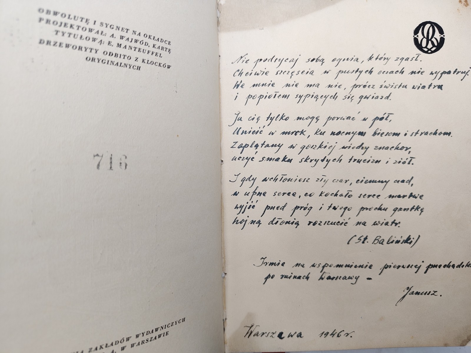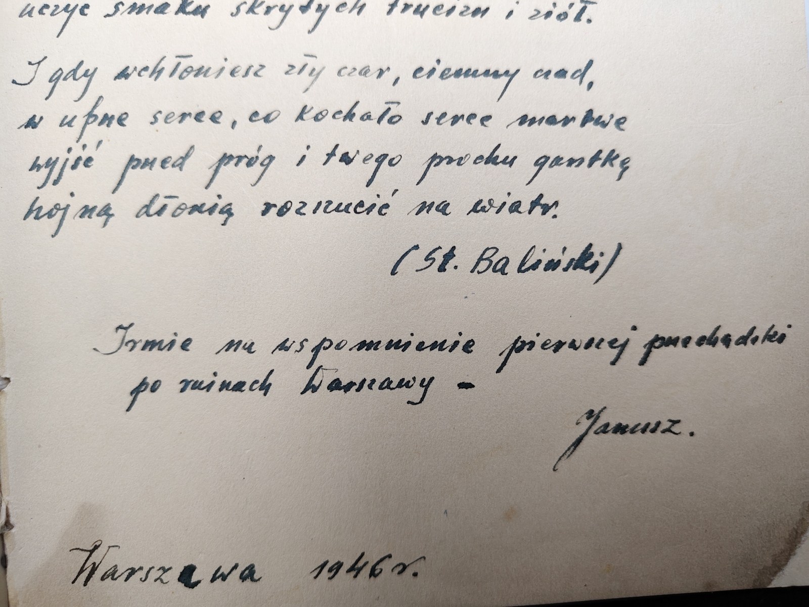 Na drugiej karcie odręczny zapis jednego z nostalgicznych wierszy Stanisława Balińskiego, a pod nim dedykacja " Jrmie na wspomnienie pierwszej przechadzki po ruinach Warszawy - Janusz. Warszawa 1946 r. "