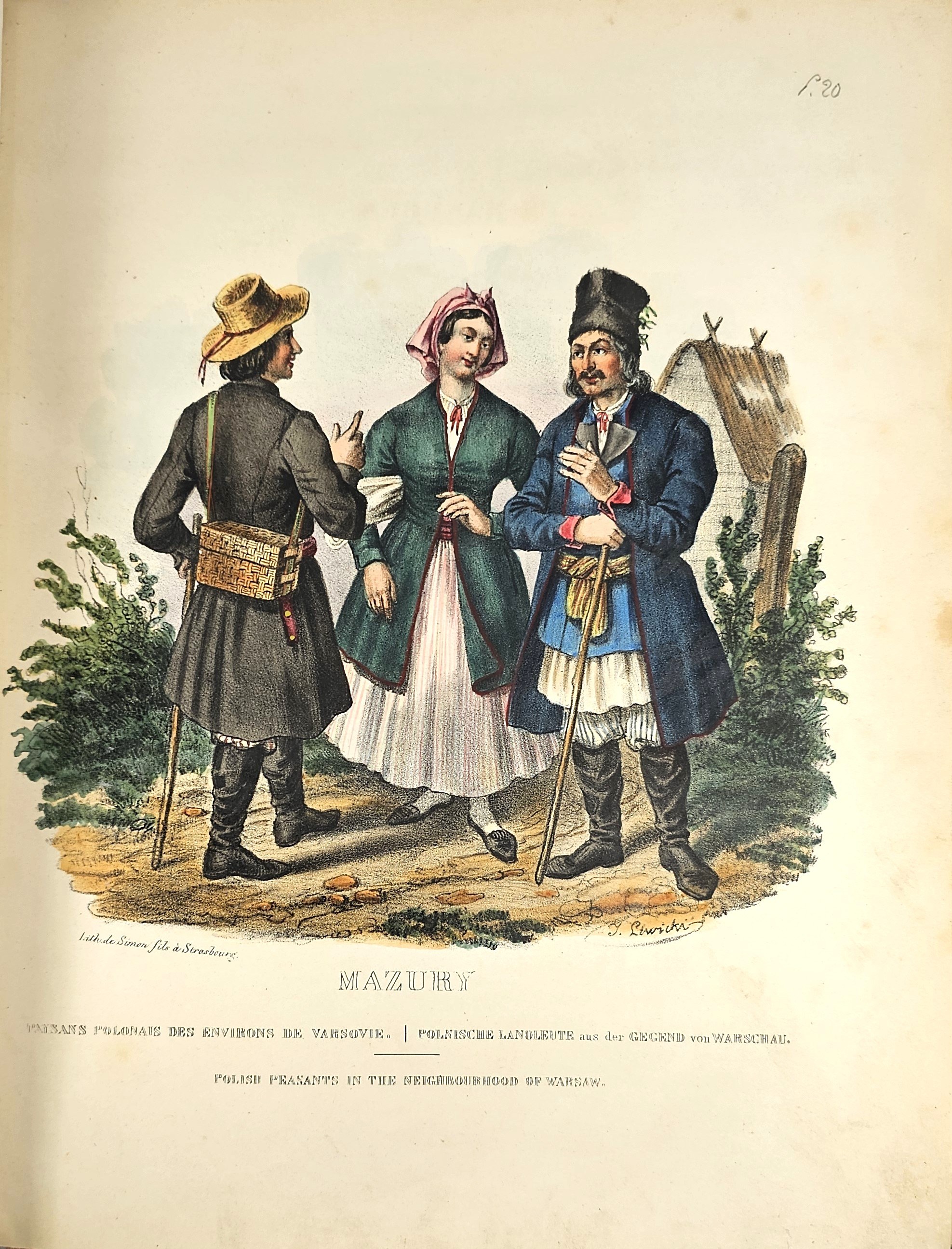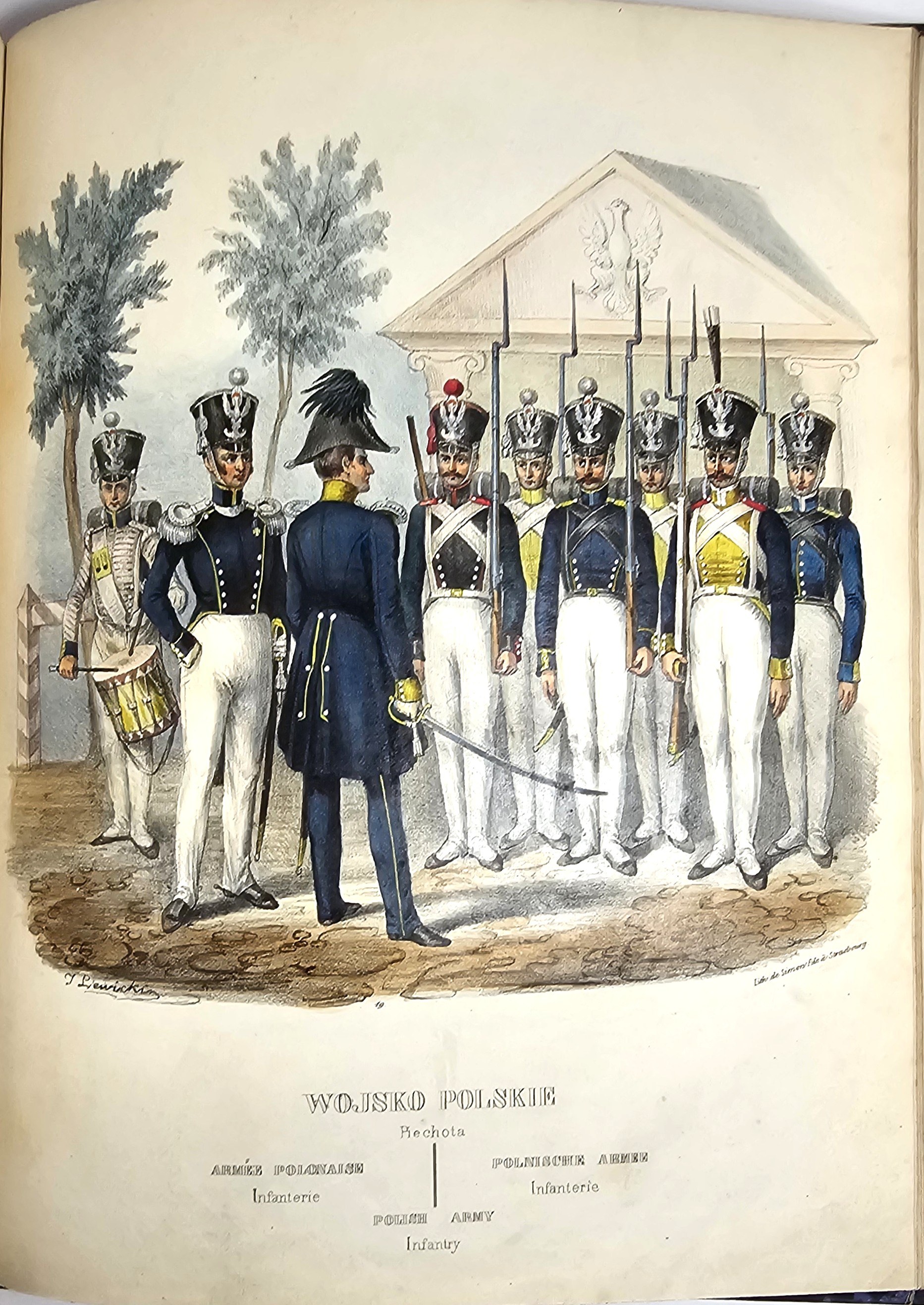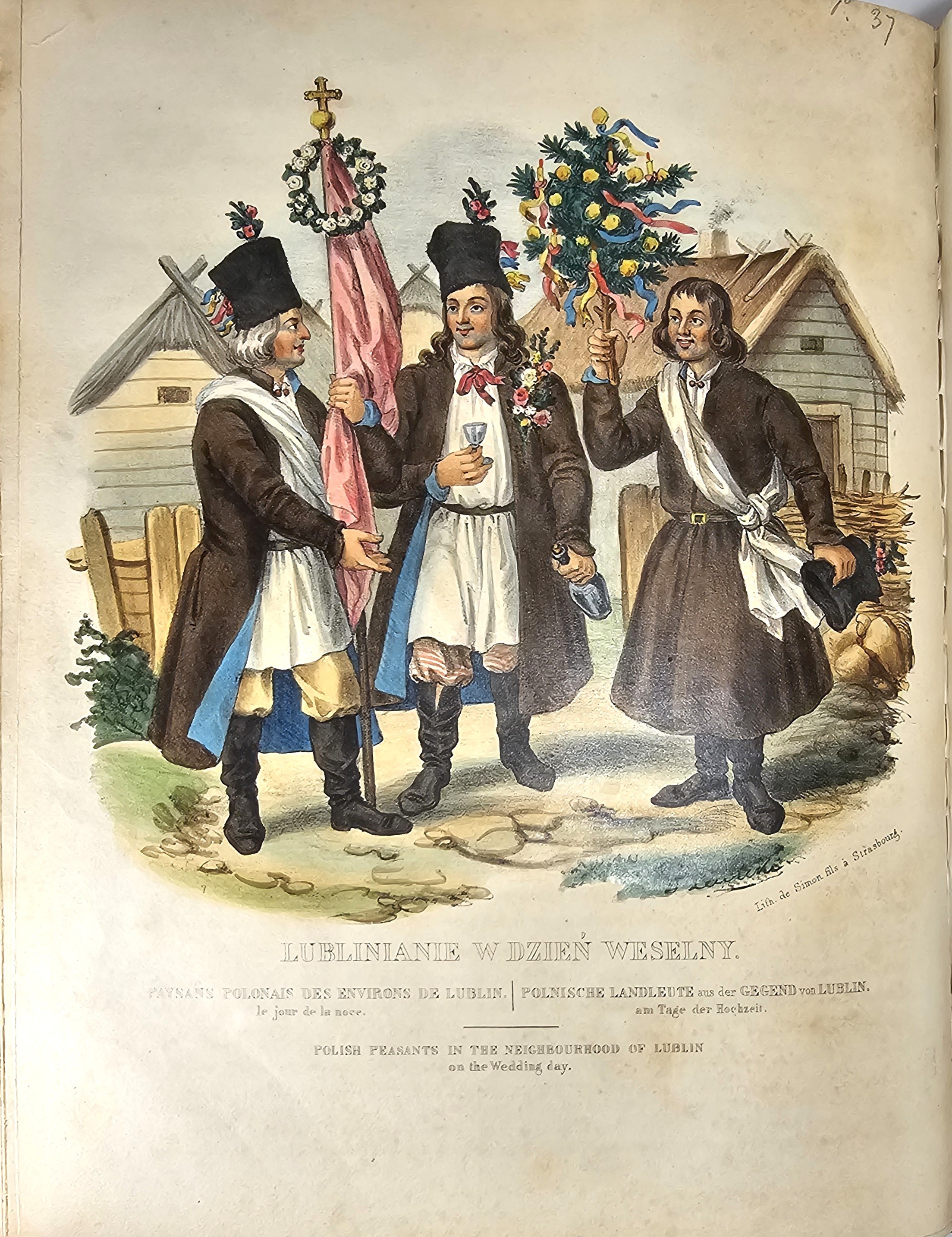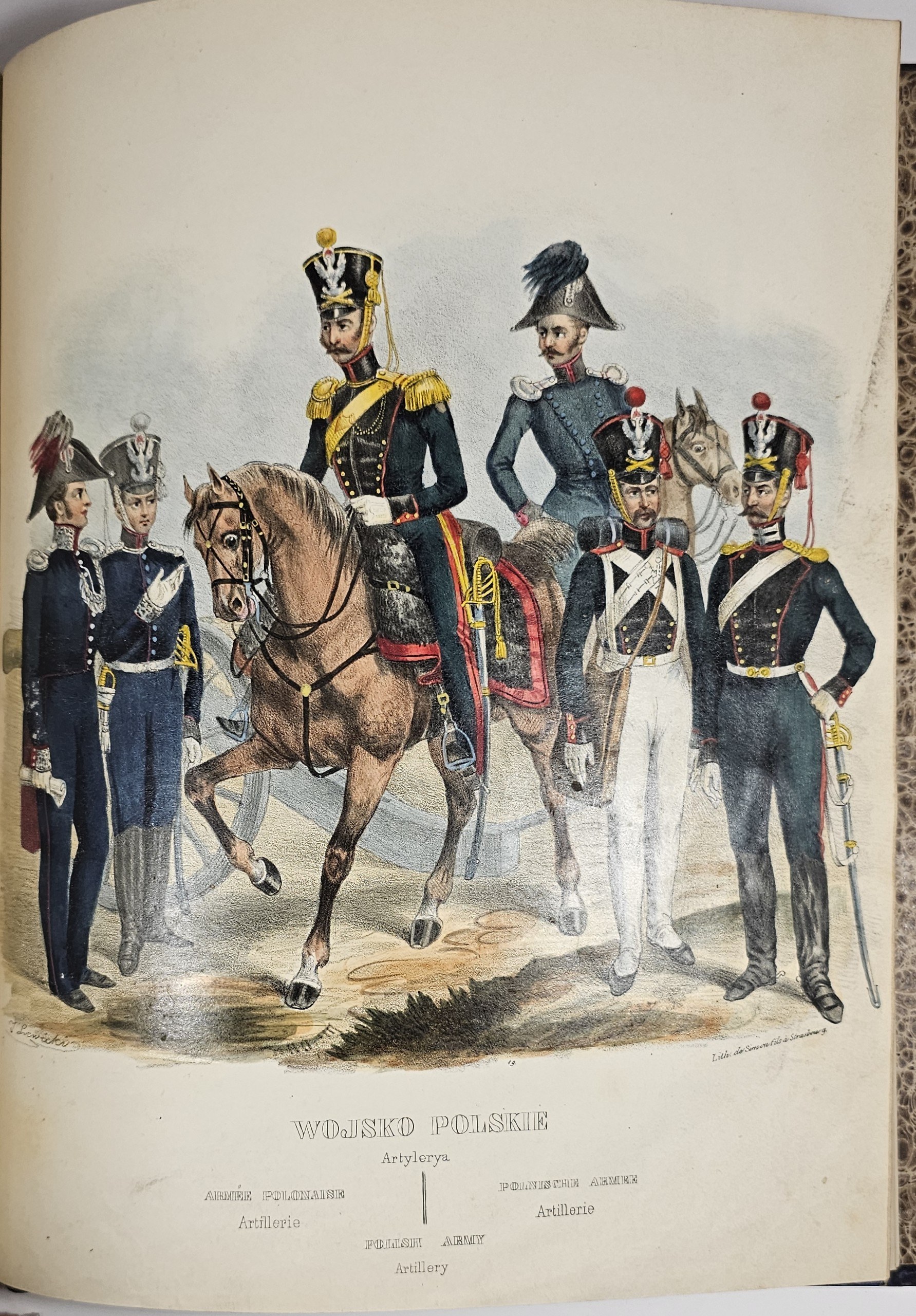28.5 cm, s. [6], 125, [1], 41 tab.: 39 ilustr. i 2 karty z zapisem nutowym, opr. psk. z epoki: skóra granatowa, karton niebiesko-czarny marmoryzowany, grzbiet sześciopolowy: złocone zdobienia i tytulatura; wyklejki oryg. marmoryzowane. Niewielkie przetarcia krawędzi oprawy, ślady po zawilgoceniach na pierwszych 6 kartach tekstu, zabrązowienia miejscami silne ale nie na tablicach, ostatnia karta spisu treści z ubytkiem podklejonym papierem, bez szkody dla tekstu. Ilustracje całostronicowe, piękne, ręcznie kolorowane litografie Jana Nepomucena Lewickiego. Ładny, efektowny egzemplarz z kompletem tablic.