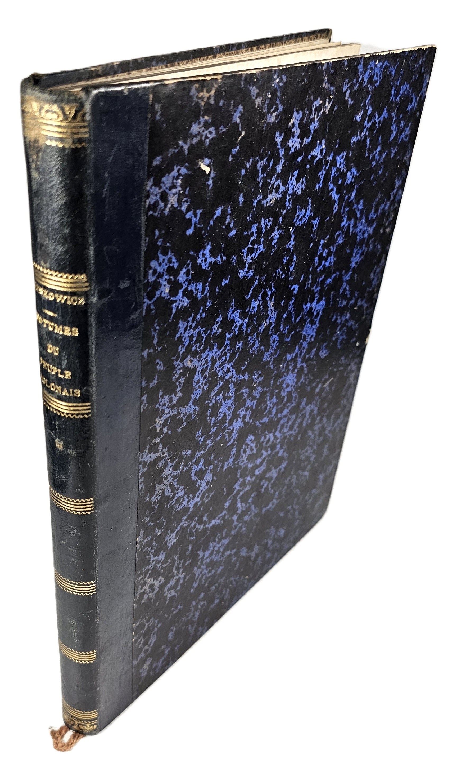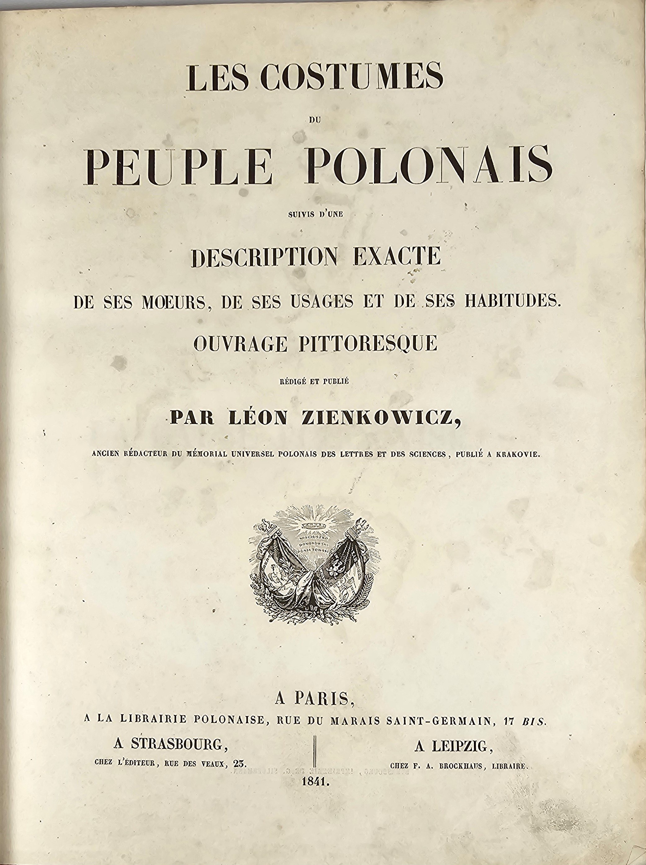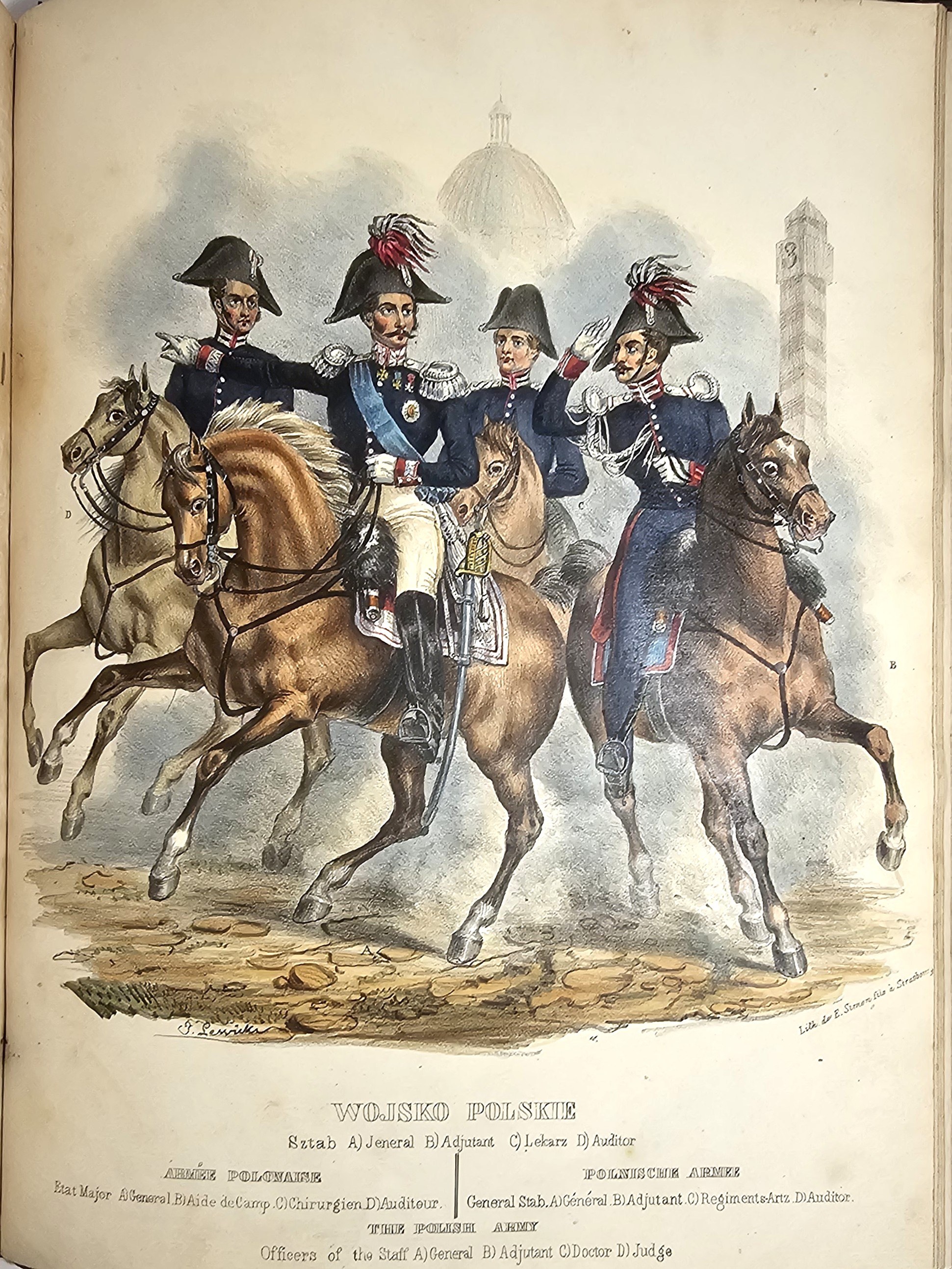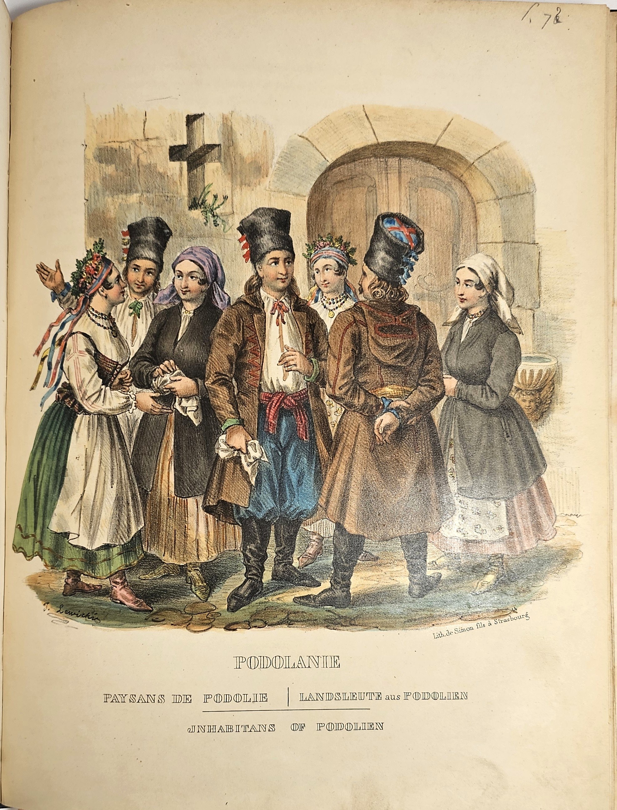 28.5 cm, s. [6], 125, [1], 41 tab.: 39 ilustr. i 2 karty z zapisem nutowym, opr. psk. z epoki: skóra granatowa, karton niebiesko-czarny marmoryzowany, grzbiet sześciopolowy: złocone zdobienia i tytulatura; wyklejki oryg. marmoryzowane. Niewielkie przetarcia krawędzi oprawy, ślady po zawilgoceniach na pierwszych 6 kartach tekstu, zabrązowienia miejscami silne ale nie na tablicach, ostatnia karta spisu treści z ubytkiem podklejonym papierem, bez szkody dla tekstu. Ilustracje całostronicowe, piękne, ręcznie kolorowane litografie Jana Nepomucena Lewickiego. Ładny, efektowny egzemplarz z kompletem tablic.