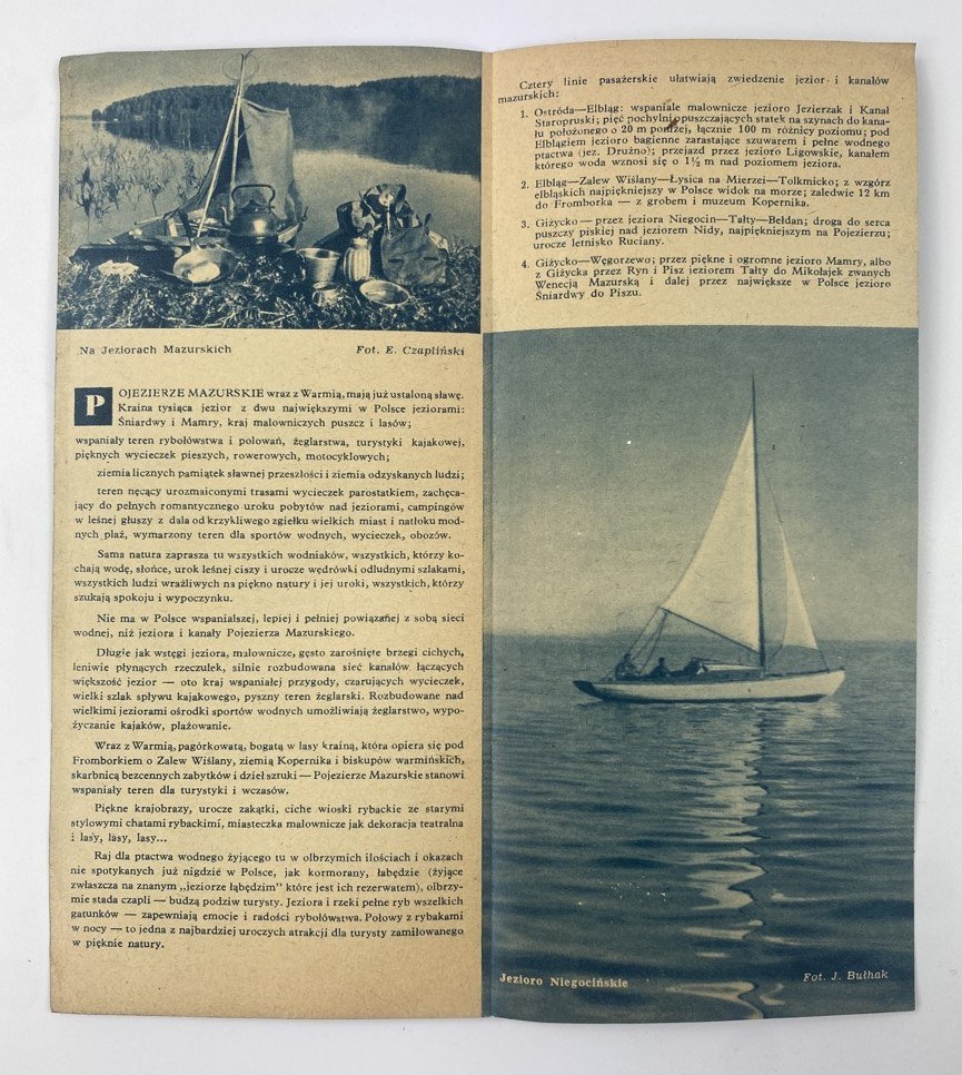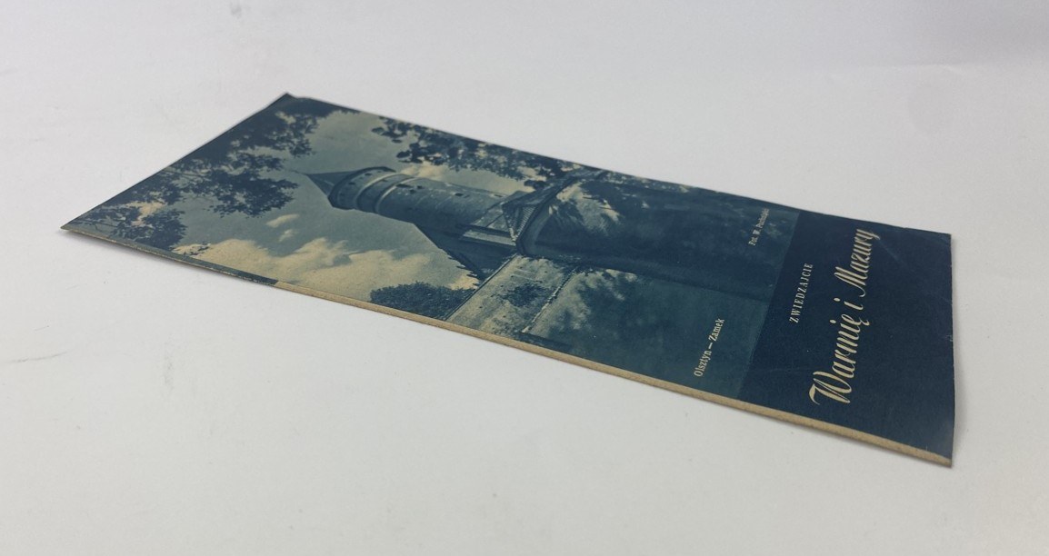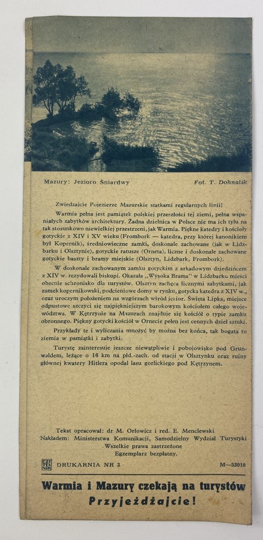 [Ulotka] Zwiedzajcie Warmię i Mazury, tekst M. Orłowicz, red. E. Menclewski, nakł. Ministerstwa Komiunikacji, Samodzielny Wydział Turystyki, ok. 1950, s. 4, wymiary 9,5 x 20,5 cm. Niewielkie złamania kart.
