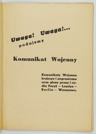 UWAGA! Uwaga!... podajemy komunikat wojenny. Komunikaty wojenne krajowe i zagraniczne oraz głosy prasy i radia Paryż, Londyn, Berlin, Warszawa. Warszawa 1940. Wyd. Nowoczesne. 8, s. 61. brosz. Seria Warszawska, t. 1.