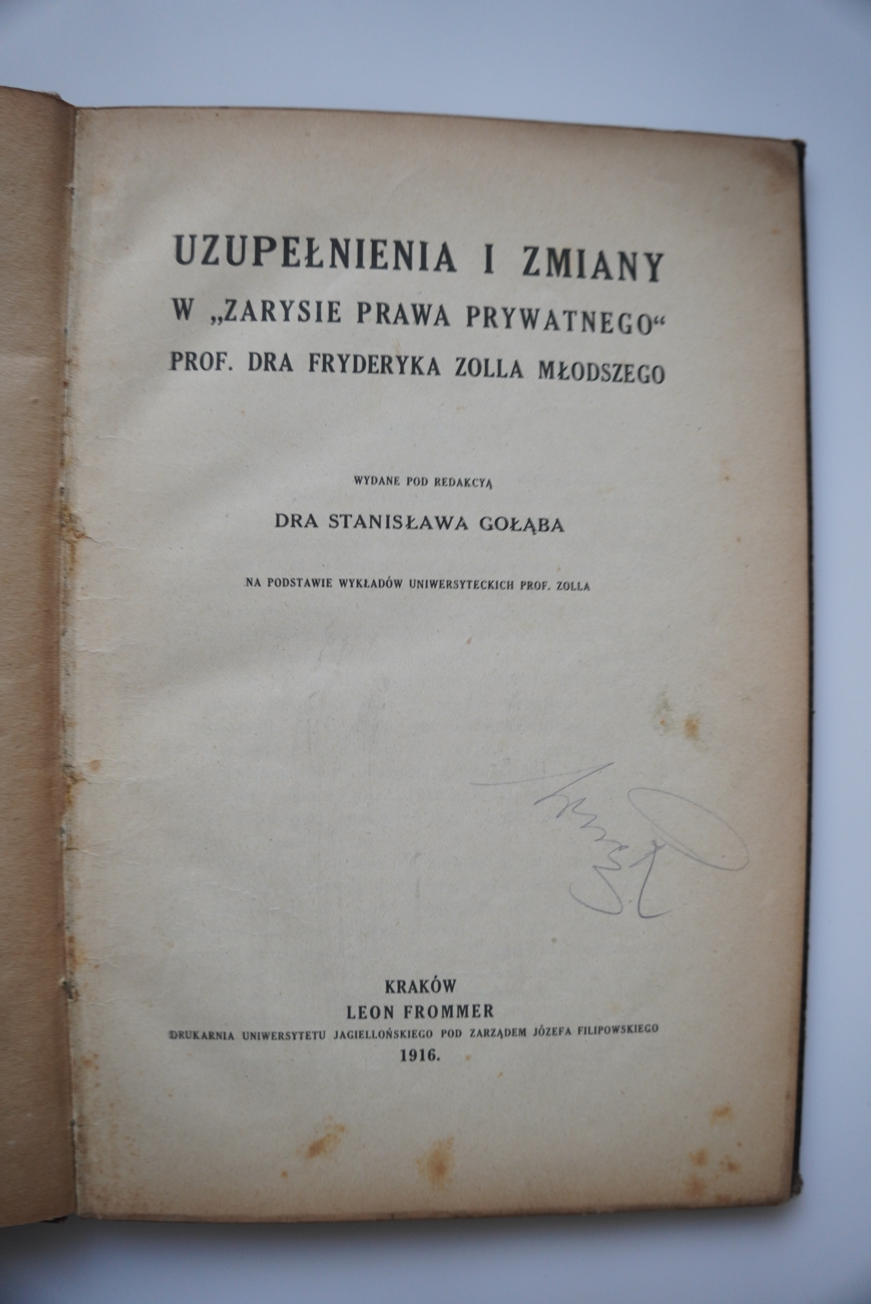 Wydane pod redakcją dra STANISŁAWA GOŁĄBA na podstawie wykładów uniwersyteckich prof. ZOLLA, KRAKÓW 1916, LEON FROMMER, drukarnia Uniwersytety jagiellońskiego pod zarządem JÓZEFA FILIPOWSKIEGO, s. 86, wym. 16 x 23, oprawa introligatorska z epoki, egzemplarz z zakreśleniami i krytycznymi uwagami. Zaplamienia.