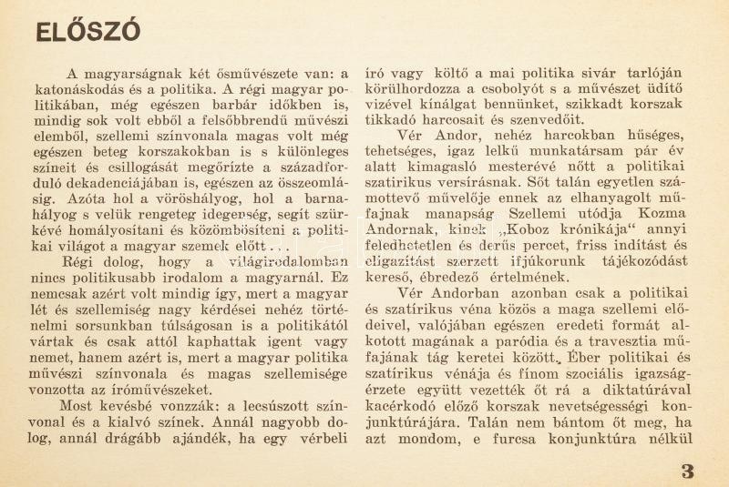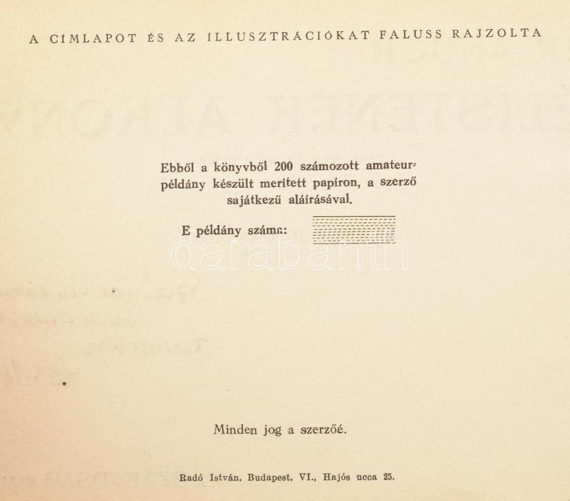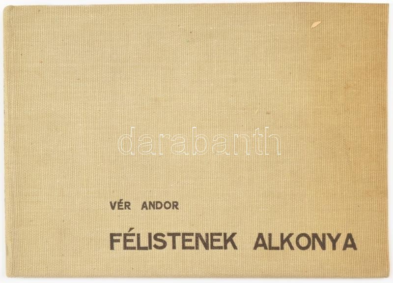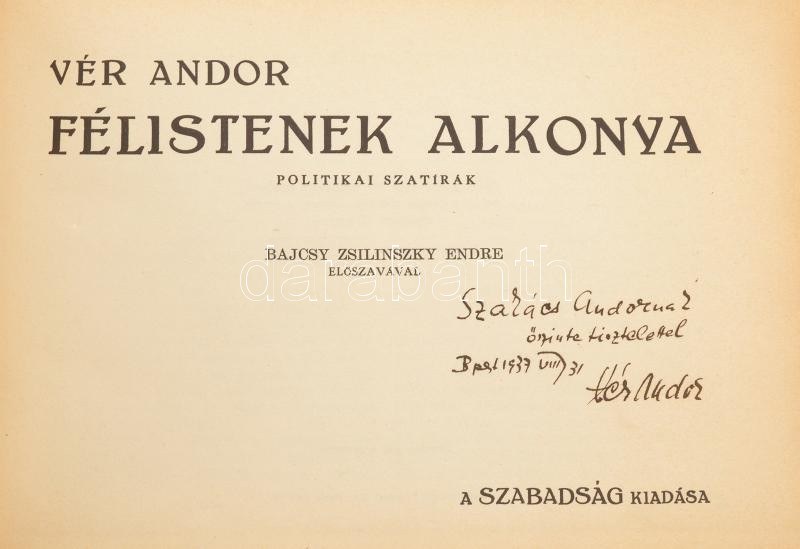 Vér Andor: Félistenek alkonya. Poltikai szatírák. A szerző, Vér Andor (1897-1976) költő, műfordító, újságíró által Szakács Andor (1877-1942) újságíró részére DEDIKÁLT példány! Bajcsy Zsilinszky Endre előszavával. A címlapot, és az illusztrációkat Faluss rajzolta. Bp., é.n., Szabadság, 108+3 p. Kiadói egészvászon-kötés. "Ebből a könyvből 200 számozott amateur-példány készült merített papíron, a szerző saját kezű aláírásával." De ez számozatlan példány!