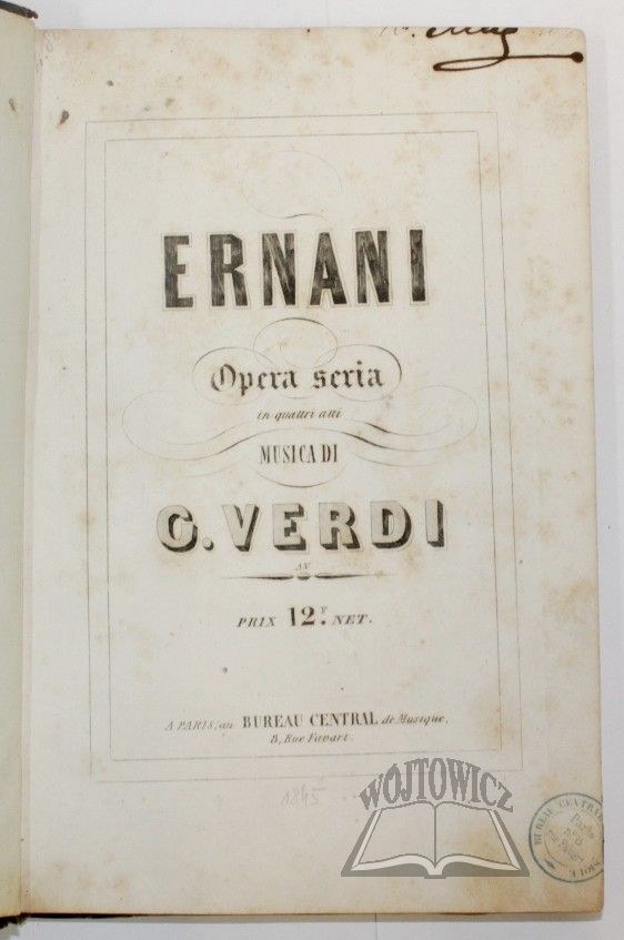 Ernani. Opera seria in quattri atti. Musica di G. Verdi. Paris (1845). Bureau Central de Musique. 4, s. [2], 199, [1] (tekst i nuty), opr. płsk. wydawn.Otarcia opr., ślady ołówka i kredki na przedniej...