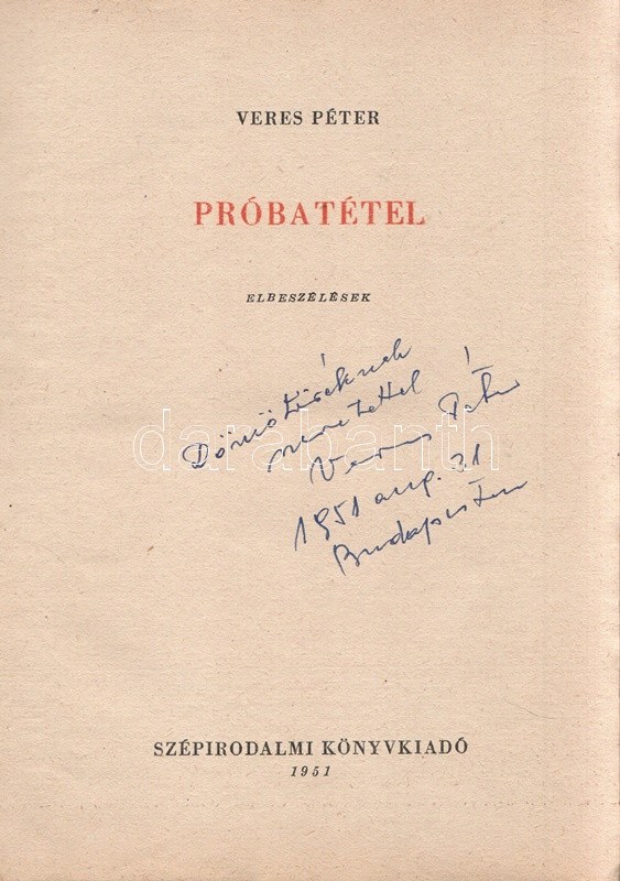 Veres Péter: Próbatétel. Elbeszélések. (Dedikált.) [Budapest], 1951. Szépirodalmi Könyvkiadó (Athenaeum ny.) 154 + [2] p. Dedikált: ,,Dömötöréknek szeretettel Veres Péter. Budapesten, 1951. aug. 31". Veres Péter novellagyűjteménye a mezőgazdasági kollektivizálás problémakörét tematizálja, a gyűjtemény először 1950-ben jelent meg, példányunk a negyedik kiadásból való. Tezla 4057. Fűzve, színes, illusztrált, enyhén elszíneződött kiadói borítóban. Jó példány.