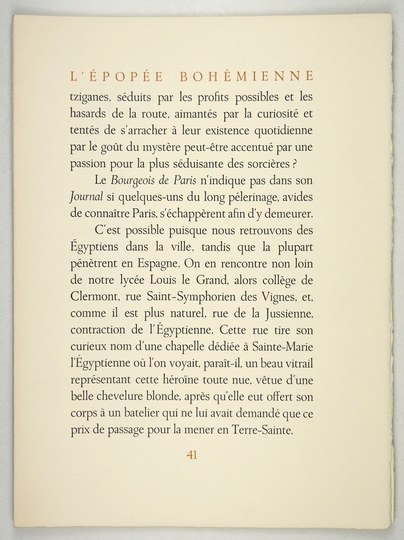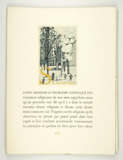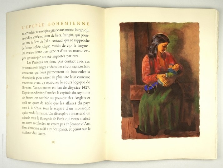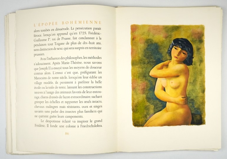 Grzbiet futerału nieco pożółkły, niewielkie otarci aobw., stan dobry. Wydano 251 egz. num. Ten egz. należy do puli 21 egzemplarzy (oznaczonych A-U) wyłączonych z handlu i nosi oznaczenie Q. Druk bibliofilski w stanie wydawniczym, tekst w składkach włożonych luzem w okładki broszurowe. Całość w oryg. pudełku-futerale (tektura oklejona płótnem) z wytłoczoną na licu podobizną podpisu Kislinga. Prezentowana pozycja zaw. w ramach paginacji 12 barwnych ilustracji światłodrukowych autorstwa Mojżesza Kislinga, 6 mniejszych ilustracji z inicjałami w drzeworycie rytowanych wg rys. Kislinga przez Pierre'a Boucheta oraz nuty "Parade" Eryka Satie nadrukowane na obwolucie i zadedykowane Kislingowi przez kompozytora. Przed kartą tyt. całostronicowy portret Kislinga wg A. Modiglianiego. Egzemplarz wyposażony w dodatkowy zestaw rycin: komplet 6 drzeworytowych inicjałów, dwa światłodruki powtórzone ze s. 2 (portret Kislinga przez Modiglianiego) i 105 (zadumana kobieta) oraz akwafortę M. Kislinga przedstawiającą młodą kobietę. Praca sygnowana na płycie, z odręcznym numerem: I/XXV. Książka opisuje dzieje i obyczaje Cyganów, głównie z terenu Francji.