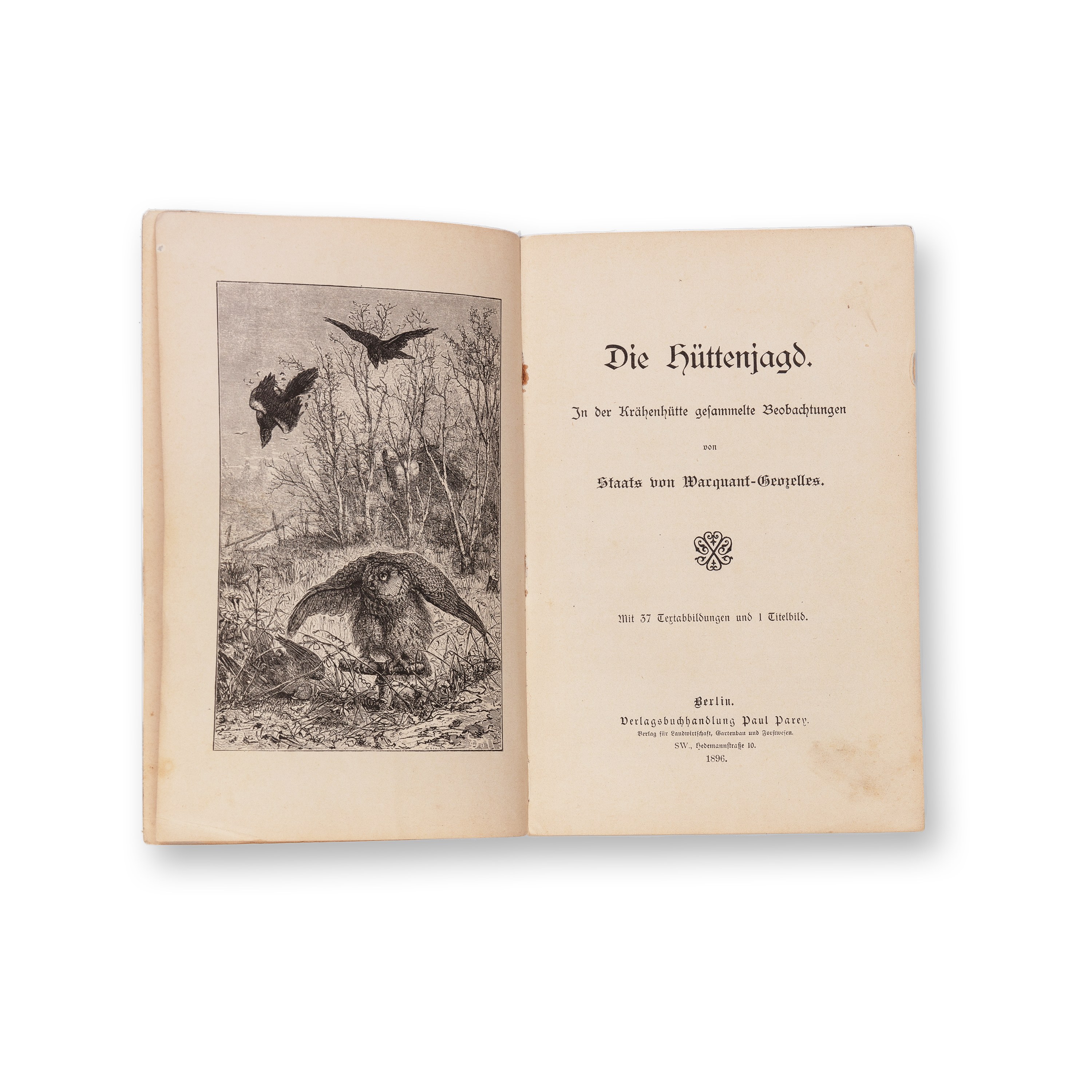 1896 | PUBLISHER: Berlin, Paul Parey | NUMBER OF PAGES: 200 | LANGUAGE: German | DIMENSIONS: 192 x 125 mm | THE FULL TITLE OF THE WORK: Die Huttenjagd. In der Krahenhutte gesammelte Beobachtungen | NOTE: illustration
