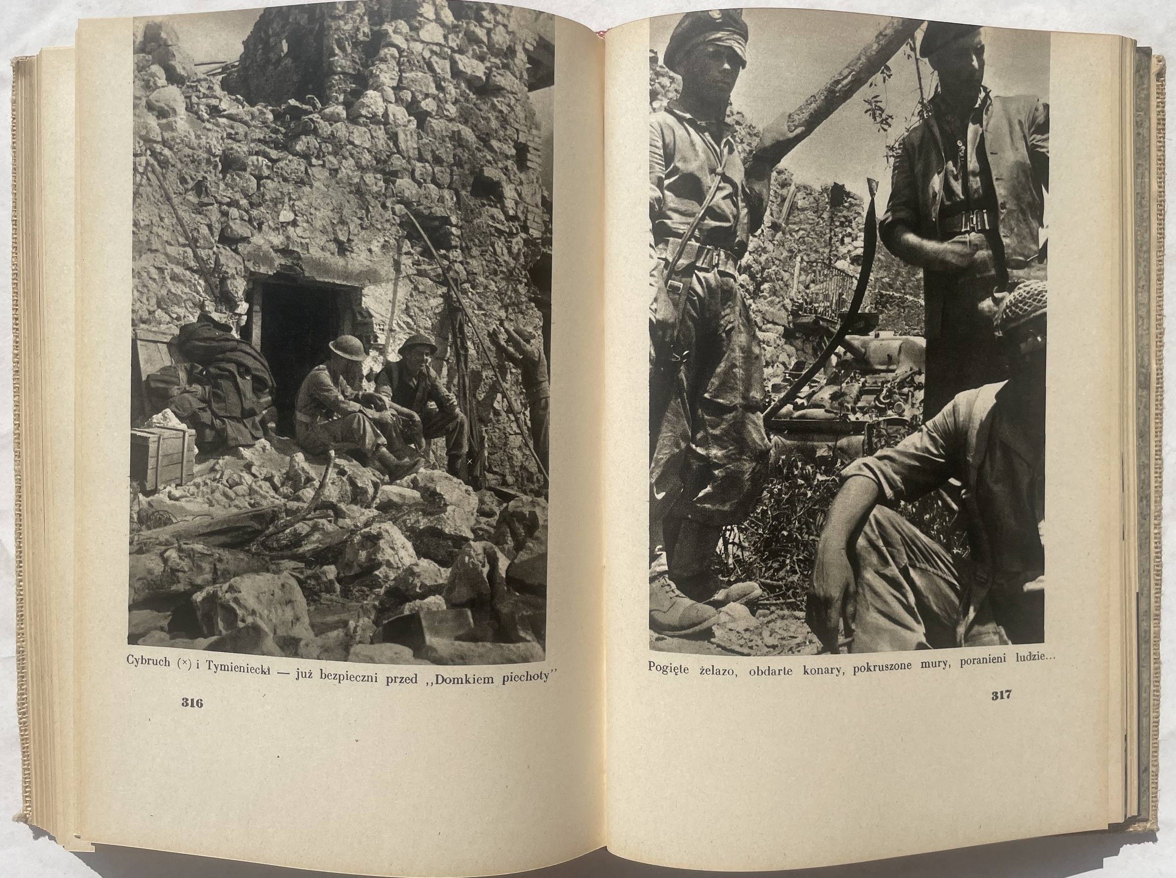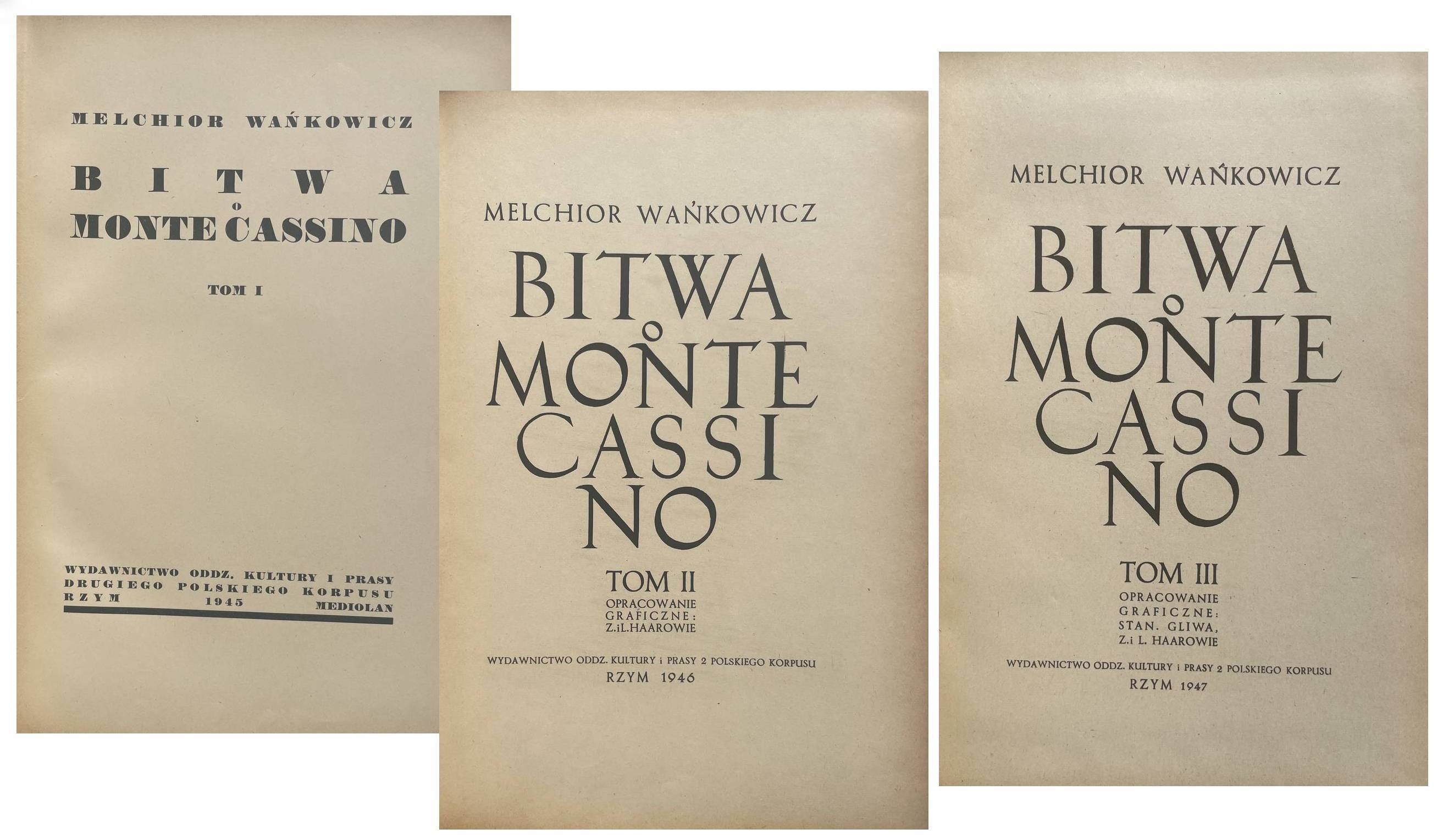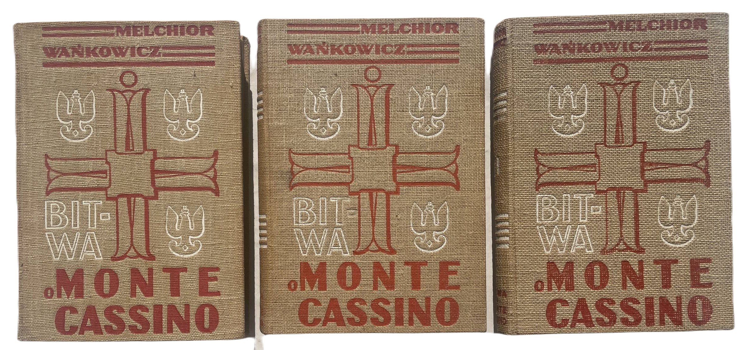 Wańkowicz Melchior, Bitwa o Monte Cassino. Tom I-III (komplet). Rzym - Mediolan 1945-1947. Wyd. Oddz. Kultury i Prasy 2 Polskiego Korpusu. 24 cm, str. 447, 392, 386, (30), liczne ilustr., mapy i szkice. Oprawa wyd. pł. zdob., w tomie drugim nieznacznie zagniecione rogi kart, poza tym stan b. dobry.